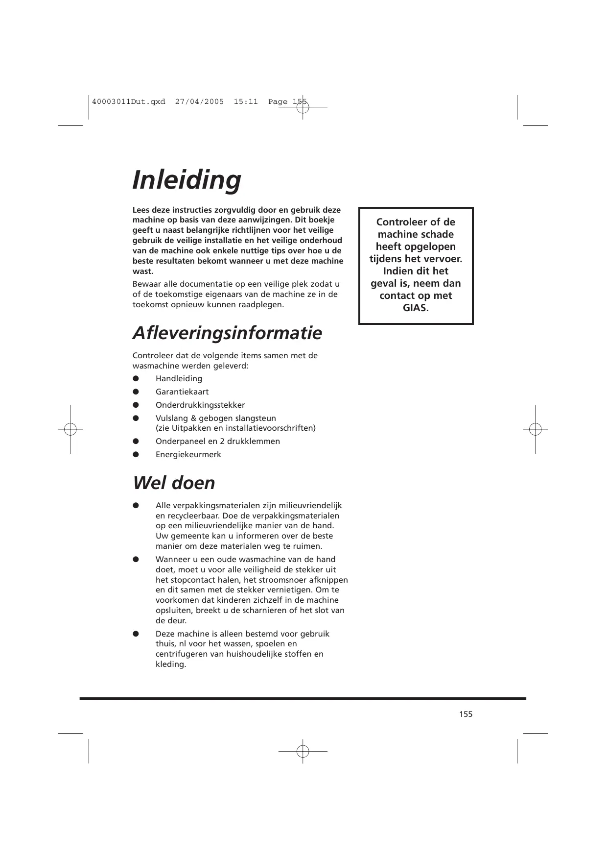 40003011Dut.qxd 27/04/2005 15:11 Page 155 Inleiding Lees deze instructies zorgvuldig door en gebruik deze machine op basis van deze aanwijzingen. Dit boekje geeft u naast belangrijke richtlijnen voor het veilige gebruik de veilige installatie en het veilige onderhoud van de machine ook enkele nuttige tips over hoe u de beste resultaten bekomt wanneer u met deze machine wast. Bewaar alle documentatie op een veilige plek zodat u of de toekomstige eigenaars van de machine ze in de toekomst opnieuw kunnen raadplegen. Controleer of de machine schade heeft opgelopen tijdens het vervoer. Indien dit het geval is, neem dan contact op met GIAS. Afleveringsinformatie Controleer dat de volgende items samen met de wasmachine werden geleverd: