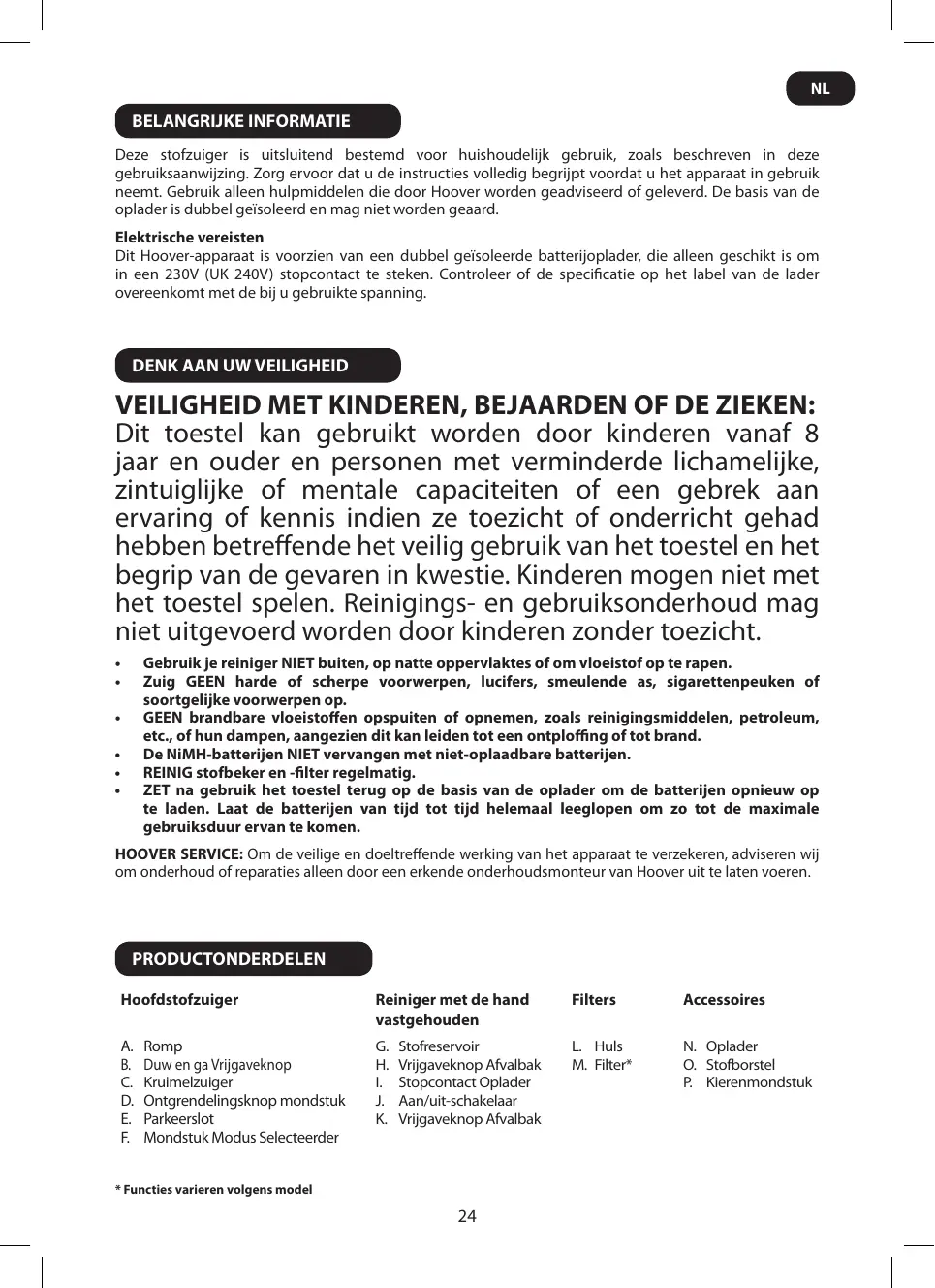 IMPORTANT : La batterie de cet aspirateur est garantie 6 mois à compter de la date d’achat. Après 6 mois, le client prend à sa charge le coût d’une nouvelle batterie qui sera placée gratuitement par un ingénieur agréé par Hoover. Consommables • • Hoover Limited Pentrebach, Merthyr Tydfil, Mid Glamorgan CF48 4TU VOTRE GARANTIE Les conditions de garantie de cet appareil sont définies par notre représentant dans le pays où il est vendu . Pour tout renseignement concernant ces conditions, contacter le revendeur de l’appareil. Toute réclamation concernant les conditions de cette garantie doit être accompagnée par la facture d’achat ou le reçu. Ces conditions peuvent être modifiées sans préavis.