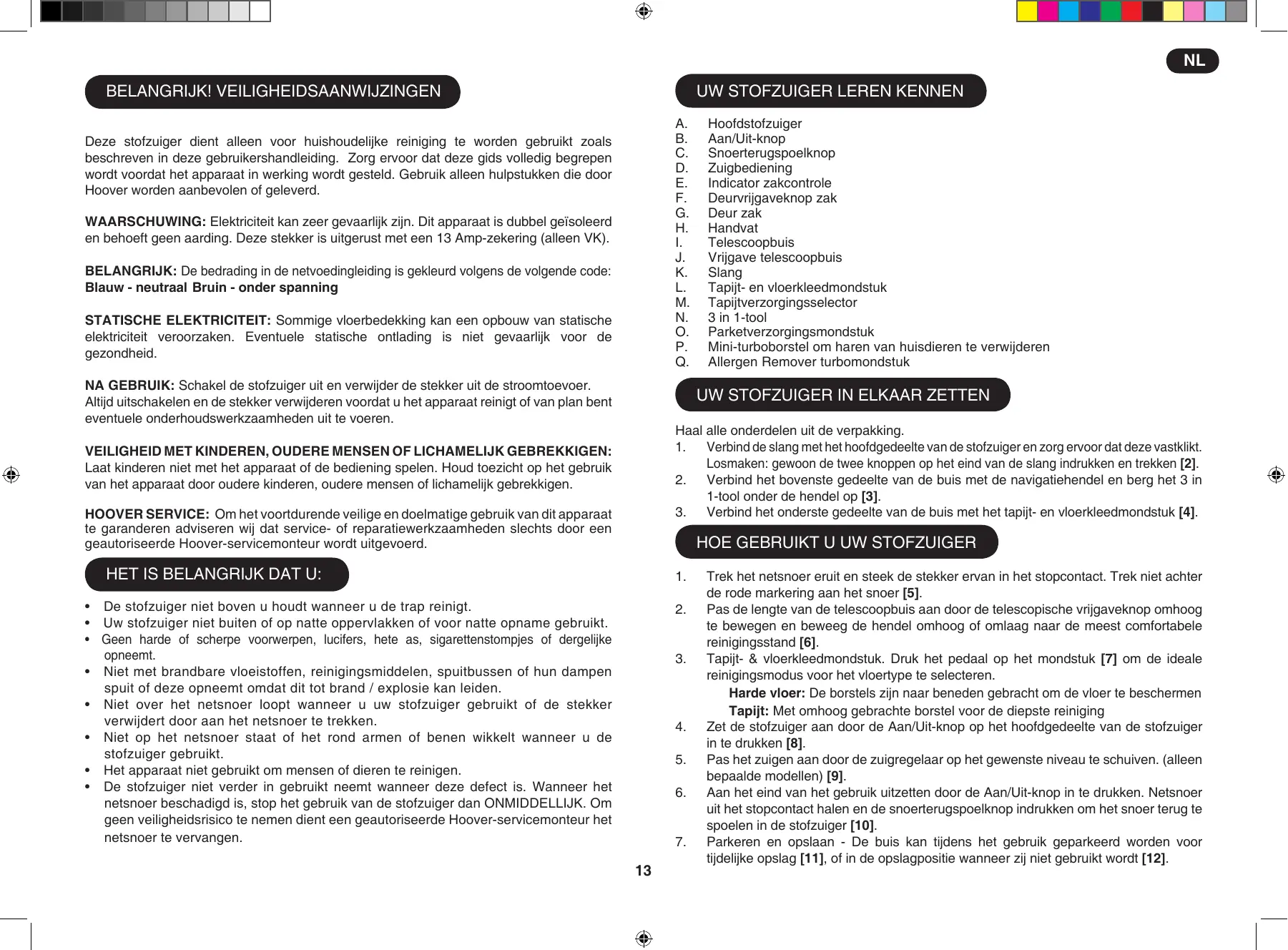 Deze stofzuiger dient alleen voor huishoudelijke reiniging te worden gebruikt zoals beschreven in deze gebruikershandleiding. Zorg ervoor dat deze gids volledig begrepen wordt voordat het apparaat in werking wordt gesteld. Gebruik alleen hulpstukken die door Hoover worden aanbevolen of geleverd. Waarschuwing: Elektriciteit kan zeer gevaarlijk zijn. Dit apparaat is dubbel geïsoleerd en behoeft geen aarding. Deze stekker is uitgerust met een 13 Amp-zekering (alleen VK). Belangrijk: De bedrading in de netvoedingleiding is gekleurd volgens de volgende code: Blauw - neutraal Bruin - onder spanning STATISCHE ELEKTRICITEIT: Sommige vloerbedekking kan een opbouw van statische elektriciteit veroorzaken. Eventuele statische ontlading is niet gevaarlijk voor de gezondheid. NA GEBRUIK: Schakel de stofzuiger uit en verwijder de stekker uit de stroomtoevoer. Altijd uitschakelen en de stekker verwijderen voordat u het apparaat reinigt of van plan bent eventuele onderhoudswerkzaamheden uit te voeren. Hoofdstofzuiger Aan/Uit-knop Snoerterugspoelknop Zuigbediening Indicator zakcontrole Deurvrijgaveknop zak Deur zak Handvat Telescoopbuis Vrijgave telescoopbuis Slang Tapijt- en vloerkleedmondstuk Tapijtverzorgingsselector 3 in 1-tool Parketverzorgingsmondstuk Mini-turboborstel om haren van huisdieren te verwijderen Allergen Remover turbomondstuk Uw stofzuiger in elkaar zetten Haal alle onderdelen uit de verpakking. Verbind de slang met het hoofdgedeelte van de stofzuiger en zorg ervoor dat deze vastklikt. Losmaken: gewoon de twee knoppen op het eind van de slang indrukken en trekken [2].