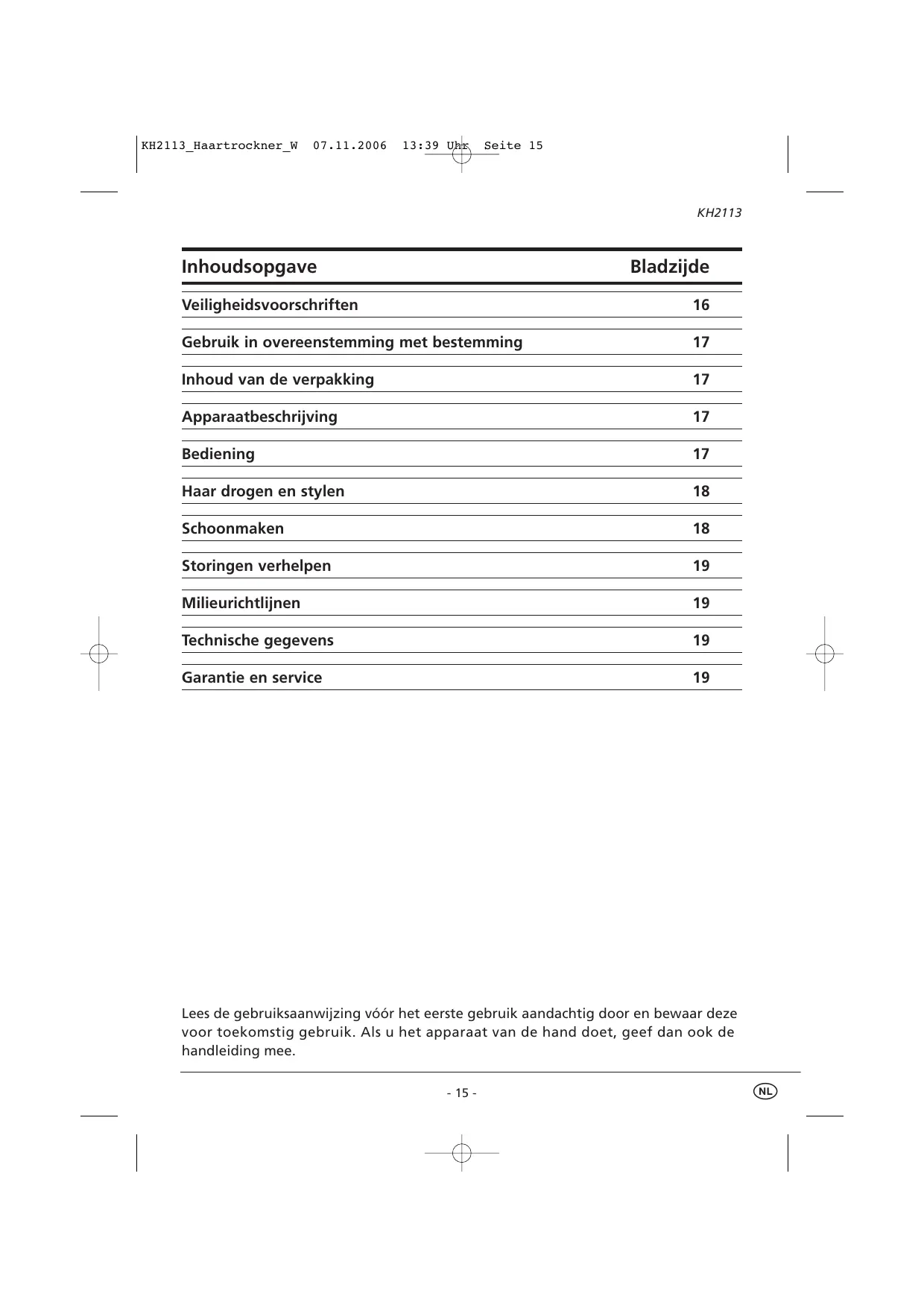 13:39 Uhr Seite 15 KH2113 Inhoudsopgave Bladzijde Veiligheidsvoorschriften