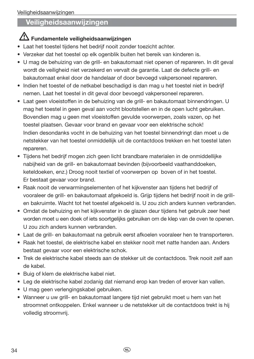 - Raak nooit de verwarmingselementen of het kijkvenster aan tijdens het bedrijf of vooraleer de grill- en bakautomaat afgekoeld is. Grijp tijdens het bedrijf nooit in de grillen bakruimte. Wacht tot het toestel afgekoeld is. U zou zich anders kunnen verbranden.