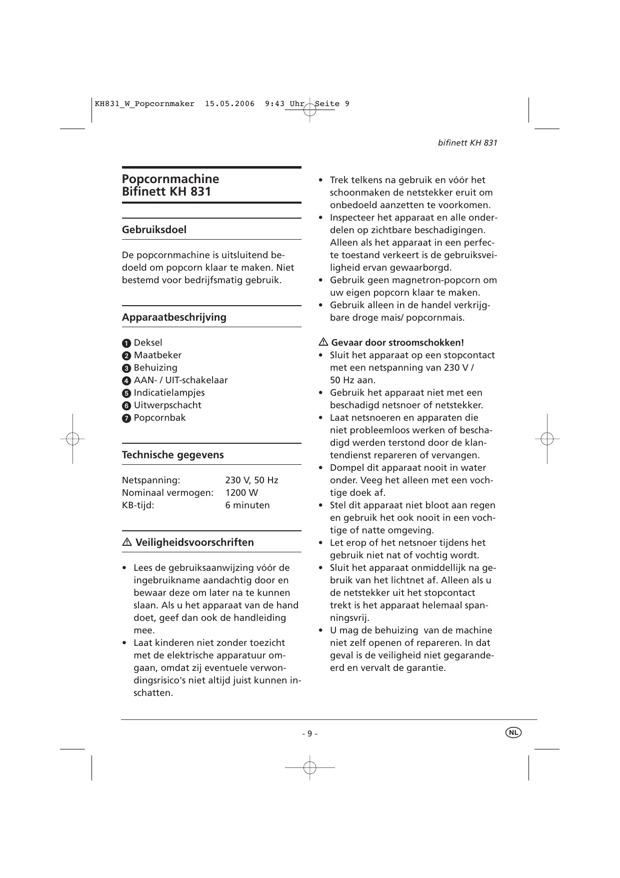 GEBRUIKSAANWIJZING BIFINETT KH 831 MACHINE A POP-CORN KOMPERNASS