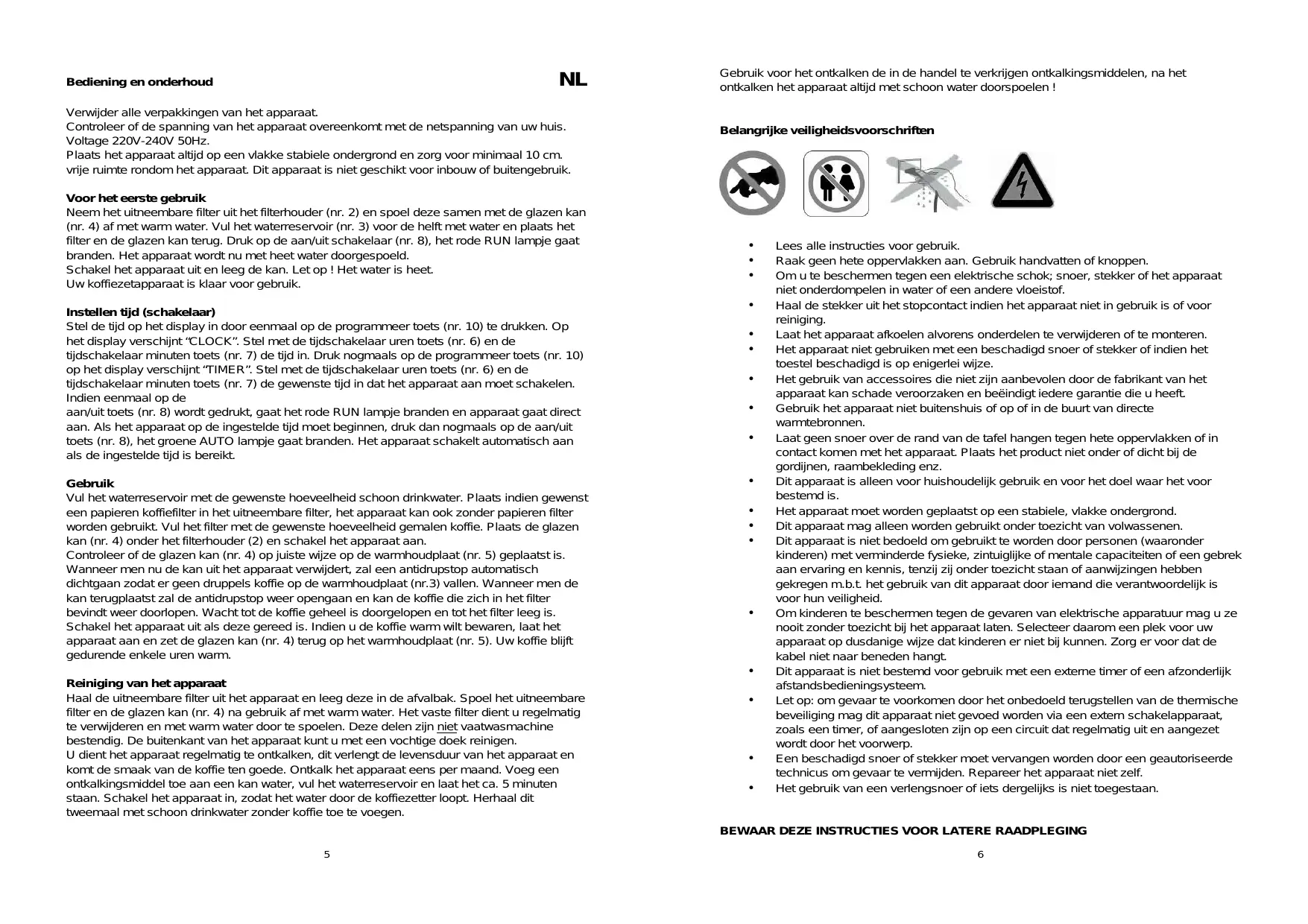 Controleer of de glazen kan (nr. 4) op juiste wijze op de warmhoudplaat (nr. 5) geplaatst is. Wanneer men nu de kan uit het apparaat verwijdert, za een antidrupstop automatisch dichtgaan zodat er geen druppels koffie op de warmhoudplaat (nr.3) vallen. Wanneer men de kan terugplaatst za de antidrupstop waar opengaan en kan de koffie die zich in het filter bevindt werk doorlopen. Wacht tot de koffie geheel is doorgelopen en tot het filter leeg is. Schakel het apparaat uit als zege gereed is. Indien u de koffie warm wilt bewaren,aaS het apparaat aan en zet de glazen kan (nr. 4) terug op het warmhoudplaat (nr. 5).Uw koffie blijf gedurende enkele uren warm.