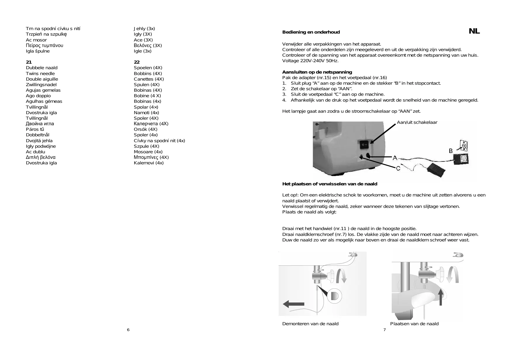 Verwijder alle verpakkingen van het apparaat. Controleer of alle onderdelen zijn meegeleverd en uit de verpakking zijn verwijderd. Controleer of de spanning van het apparaat overeenkomt met de netspanning van uw huis. Voltage 220V-240V 50Hz. Aansluiten op de netspanning Pak de adapter (nr.15) en het voetpedaal (nr.16) 1. Sluit plug “A” aan op de machine en de stekker “B” in het stopcontact. 2. Zet de schakelaar op “AAN”. 3. Sluit de voetpedaal “C” aan op de machine. 4. Afhankelijk van de druk op het voetpedaal wordt de snelheid van de machine geregeld. Het lampje gaat aan zodra u de stroomschakelaar op “AAN” zet. Aan/uit schakelaar