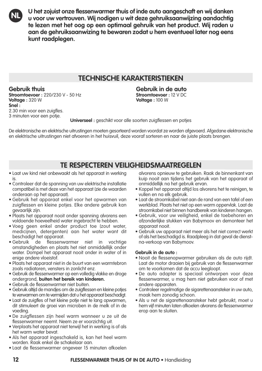 U het zojuist onze flessenwarmer thuis of inde auto aangeschaft en wij danken u voor uw vertrouven. Wij nodigen u wit deze gehruiksaanwijzing aandachtig te lezen met het oog op een optimaal gehruik van het product. Wij raden u aan de gehruiksaanwizing te bewaren zodat u hem eventueel later nog eens kunt raadplegen. TECHNISCHE KARAKTERISTIEKEN Gebruik thuis Gebruik in de auto Stroomtoevoer : 220/230 V - 50 Hz Stroomtoevoer : 12 V DC Voltage : 320 W Voltage : 100 W Snel :