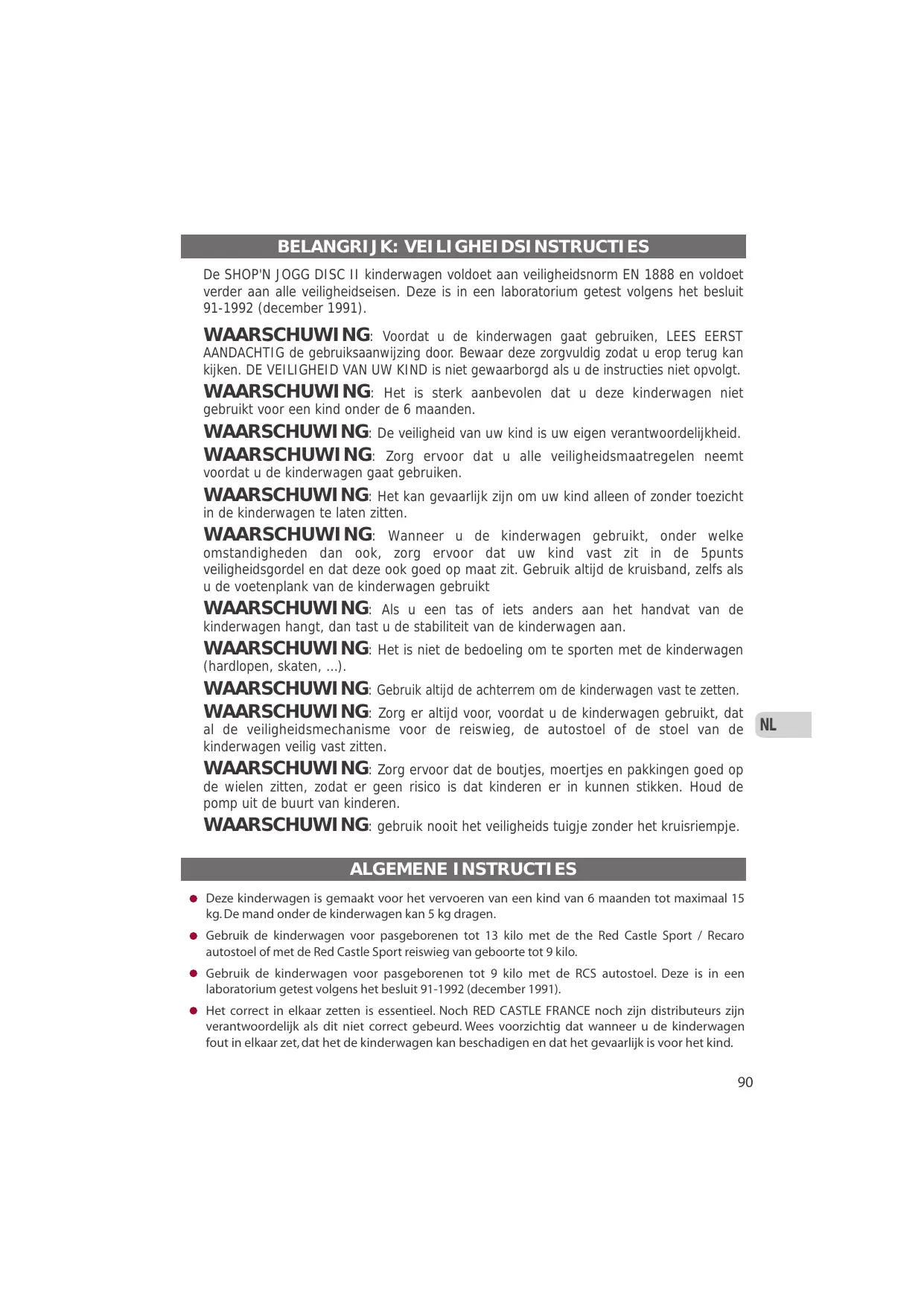 INSTRUCTIONS GENERALES Cette poussette est conçue pour transporter un enfant âgé de 6 mois et jusqu'à un poids maximum de 15 kg, ainsi qu'une charge additionnelle de 5 kg dans le panier sous la poussette. Dès la naissance, utilisez la poussette en combiné avec le Siège Auto RED CASTLE SPORT / RECARO Groupe 0+ jusqu'à 13 kg OU avec la nacelle RED CASTLE SPORT jusqu'à 9 kg. Dès la naissance, utilisez la poussette en combiné avec le Siège Auto RCS Groupe 0 jusqu'à 9 kg. Ce combiné est conforme aux exigences de sécurité et a été testé en laboratoire agréé selon décret 91-1992 (décembre 1991). L'assemblage correct du produit est essentiel et n'engage la responsabilité ni du distributeur, ni celle de RED CASTLE FRANCE. Notez qu'une utilisation incorrecte peut endommager votre poussette et mettre en danger votre enfant. Ne transportez jamais plus d'un enfant dans la poussette SHOP'N JOGG DISC II.