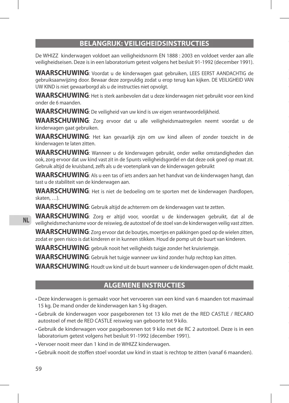 • Cette poussette est conçue pour transporter un enfant âgé de 6 mois et jusqu’à un poids maximum de 15 kg, ainsi qu’une charge additionnelle de 5 kg dans le panier sous la poussette. • Dès la naissance, utilisez la poussette en combiné avec le Siège Auto RED CASTLE / RECARO Groupe 0+ jusqu’à 13 kg OU avec la nacelle RED CASTLE jusqu’à 9 kg. • Dès la naissance, utilisez la poussette en combiné avec le Siège Auto RC 2 Groupe 0 jusqu’à 9 kg. Ce combiné est conforme aux exigences de sécurité et a été testé en laboratoire agréé selon le décret 91-1992 (décembre 1991). • N’utilisez pas cette poussette avant que votre enfant soit capable de se maintenir assis sans aide (à partir de 6 mois).