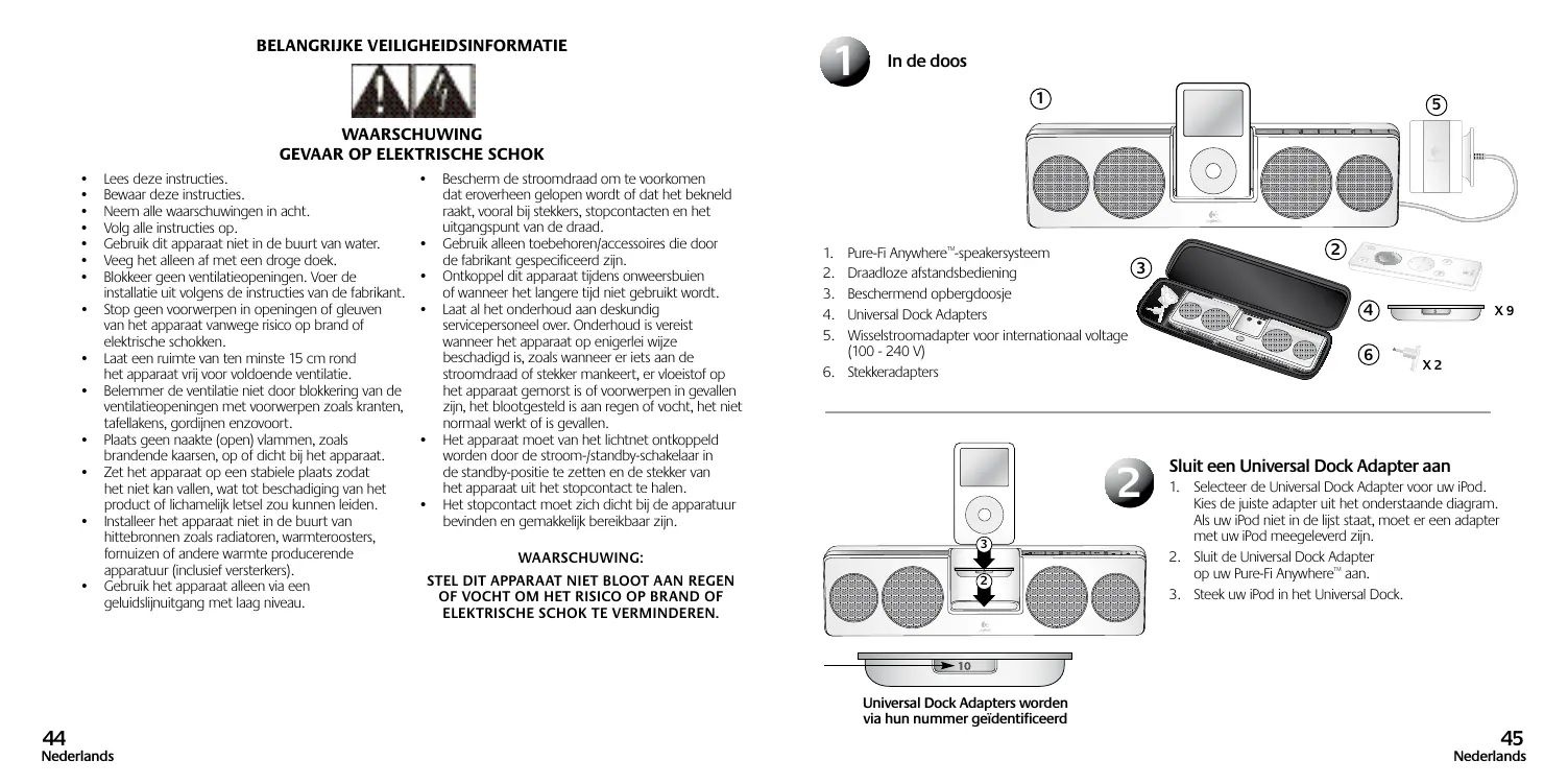 1. Selecteer de Universal Dock Adapter voor uw iPod. Kies de juiste adapter uit het onderstaande diagram. Als uw iPod niet in de lijst staat, moet er een adapter met uw iPod meegeleverd zijn. 2. Sluit de Universal Dock Adapter op uw Pure-Fi Anywhere™ aan. 3. Steek uw iPod in het Universal Dock.