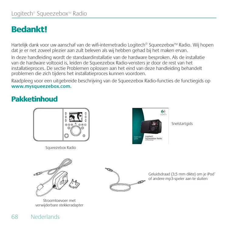 Logitech® Squeezebox™ Radio Bedankt! Hartelijk dank voor uw aanschaf van de wifi-internetradio Logitech® Squeezebox™ Radio. Wij hopen dat je er net zoveel plezier aan zult beleven als wij hebben gehad bij het maken ervan. In deze handleiding wordt de standaardinstallatie van de hardware besproken. Als de installatie van de hardware voltooid is, leiden de Squeezebox Radio-vensters je door de rest van het installatieproces. De sectie Problemen oplossen aan het eind van deze handleiding behandelt problemen die zich tijdens het installatieproces kunnen voordoen. Raadpleeg voor een uitgebreide beschrijving van de Squeezebox Radio-functies de functiegids op www.mysqueezebox.com. Pakketinhoud