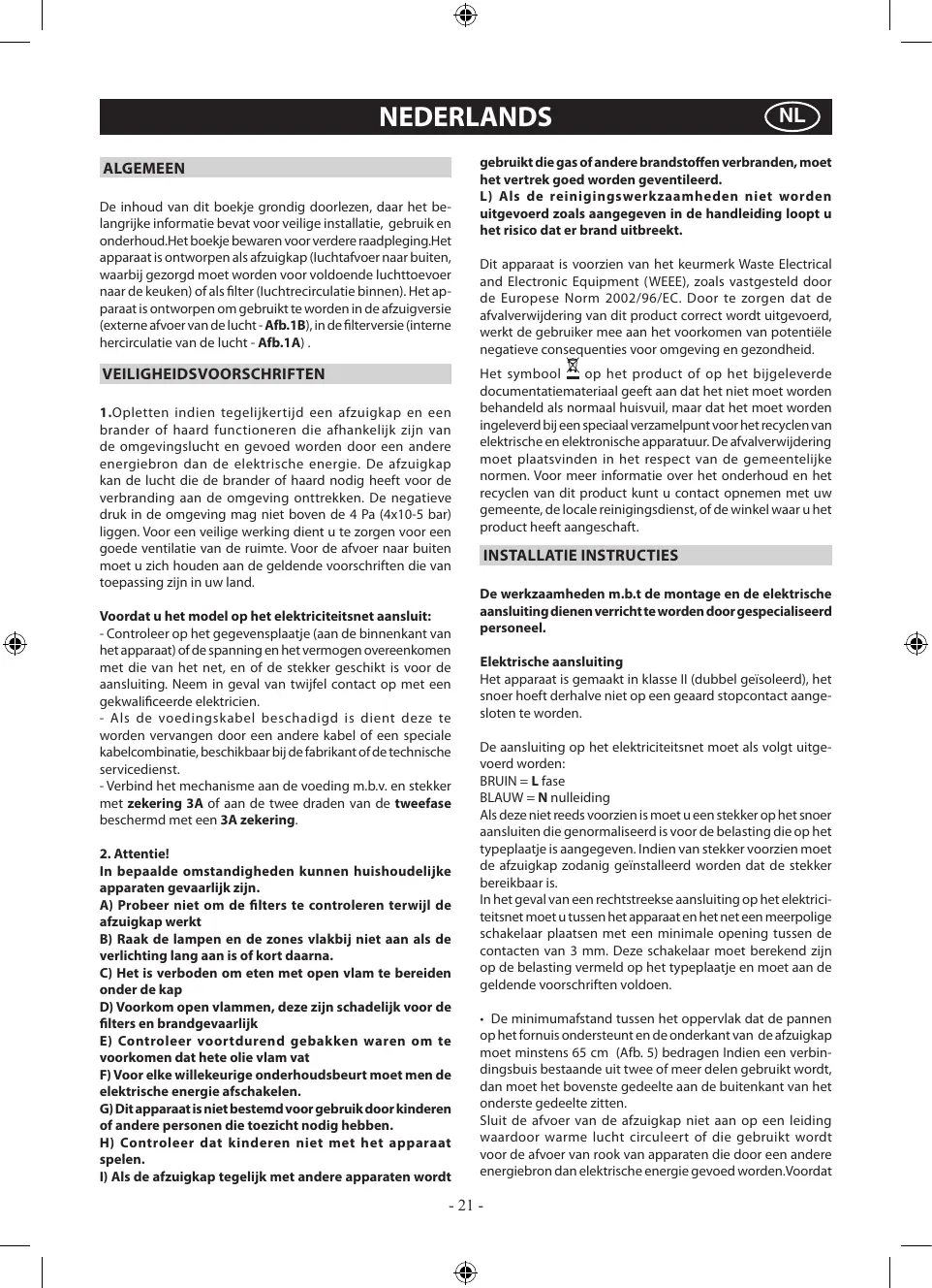 NEDERLANDS ALGEMEEN De inhoud van dit boekje grondig doorlezen, daar het belangrijke informatie bevat voor veilige installatie, gebruik en onderhoud.Het boekje bewaren voor verdere raadpleging.Het apparaat is ontworpen als afzuigkap (Iuchtafvoer naar buiten, waarbij gezorgd moet worden voor voldoende luchttoevoer naar de keuken) of als filter (Iuchtrecirculatie binnen). Het apparaat is ontworpen om gebruikt te worden in de afzuigversie (externe afvoer van de lucht - Afb.1B), in de filterversie (interne hercirculatie van de lucht - Afb.1A) . VEILIGHEIDSVOORSCHRIFTEN 1.Opletten indien tegelijkertijd een afzuigkap en een brander of haard functioneren die afhankelijk zijn van de omgevingslucht en gevoed worden door een andere energiebron dan de elektrische energie. De afzuigkap kan de lucht die de brander of haard nodig heeft voor de verbranding aan de omgeving onttrekken. De negatieve druk in de omgeving mag niet boven de 4 Pa (4x10-5 bar) liggen. Voor een veilige werking dient u te zorgen voor een goede ventilatie van de ruimte. Voor de afvoer naar buiten moet u zich houden aan de geldende voorschriften die van toepassing zijn in uw land. Voordat u het model op het elektriciteitsnet aansluit: - Controleer op het gegevensplaatje (aan de binnenkant van het apparaat) of de spanning en het vermogen overeenkomen met die van het net, en of de stekker geschikt is voor de aansluiting. Neem in geval van twijfel contact op met een gekwalificeerde elektricien. - Als de voedingskabel beschadigd is dient deze te worden vervangen door een andere kabel of een speciale kabelcombinatie, beschikbaar bij de fabrikant of de technische servicedienst. - Verbind het mechanisme aan de voeding m.b.v. en stekker met zekering 3A of aan de twee draden van de tweefase beschermd met een 3A zekering.