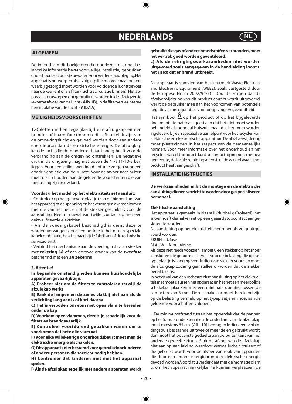 - Opletten indien tegelijkkortijd een afzuiigkap en een brander of haard functioneren die afhankelijk zijn van de omgevingslucht en gevoed worden door een andere energiebron dan de elektrischenergie. De afzuiigkap kan de lucht die de brander of haard nodig heeft voor de verbranding aan de omgeving onttrekken. De negatieve druk in de omgeving mag Niet boven de 4 Pa (4x10-5 bar) liggen. Voor een veilige werkung dient u te zorgen voor een goede ventilatie van de ruimte. Voor de afvoer maar buiten moet u zich honden aan de geldende voorschriften die van toepassing�in uw land.