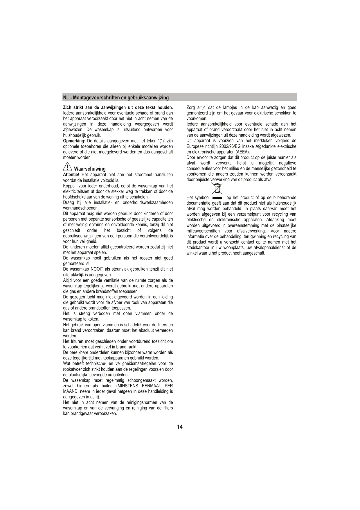NL - Montagevoorschriften en gebruiksaanwijzing Zorg altijd dat de lampjes in de kap aanwezig en goed gemonteerd zijn om het gevaar voor elektrische schokken te voorkomen. Iedere aansprakelijkheid voor eventuele schade aan het apparaat of brand veroorzaakt door het niet in acht nemen van de aanwijzingen uit deze handleiding wordt afgewezen. Dit apparaat is voorzien van het merkteken volgens de Europese richtlijn 2002/96/EG inzake Afgedankte elektrische en elektronische apparaten (AEEA). Door ervoor te zorgen dat dit product op de juiste manier als afval wordt verwerkt, helpt u mogelijk negatieve consequenties voor het milieu en de menselijke gezondheid te voorkomen die anders zouden kunnen worden veroorzaakt door onjuiste verwerking van dit product als afval. Zich strikt aan de aanwijzingen uit deze tekst houden. Iedere aansprakelijkheid voor eventuele schade of brand aan het apparaat veroorzaakt door het niet in acht nemen van de aanwijzingen in deze handleiding weergegeven wordt afgewezen. De wasemkap is uitsluitend ontworpen voor huishoudelijk gebruik. Opmerking: De details aangegeven met het teken “(*)” zijn optionele toebehoren die alleen bij enkele modellen worden geleverd of die niet meegeleverd worden en dus aangeschaft moeten worden. Waarschuwing Attentie! Het apparaat niet aan het stroomnet aansluiten voordat de installatie voltooid is. Koppel, voor ieder onderhoud, eerst de wasemkap van het elektriciteitsnet af door de stekker weg te trekken of door de hoofdschakelaar van de woning uit te schakelen. Draag bij alle installatie- en onderhoudswerkzaamheden werkhandschoenen. Dit apparaat mag niet worden gebruikt door kinderen of door personen met beperkte sensorische of geestelijke capaciteiten of met weinig ervaring en onvoldoende kennis, tenzij dit niet geschiedt onder het toezicht of volgens de gebruiksaanwijzingen van een persoon die verantwoordelijk is voor hun veiligheid. De kinderen moeten altijd gecontroleerd worden zodat zij niet met het apparaat spelen. De wasemkap nooit gebruiken als het rooster niet goed gemonteerd is! De wasemkap NOOIT als steunvlak gebruiken tenzij dit niet uitdrukkelijk is aangegeven. Altijd voor een goede ventilatie van de ruimte zorgen als de wasemkap tegelijkertijd wordt gebruikt met andere apparaten die gas en andere brandstoffen toepassen. De gezogen lucht mag niet afgevoerd worden in een leiding die gebruikt wordt voor de afvoer van rook van apparaten die gas of andere brandstoffen toepassen. Het is streng verboden met open vlammen onder de wasemkap te koken. Het gebruik van open vlammen is schadelijk voor de filters en kan brand veroorzaken, daarom moet het absoluut vermeden worden. Het frituren moet geschieden onder voortdurend toezicht om te voorkomen dat verhit vet in brand raakt. De bereikbare onderdelen kunnen bijzonder warm worden als deze tegelijkertijd met kookapparaten gebruikt worden. Wat betreft technische- en veiligheidsmaatregelen voor de rookafvoer zich strikt houden aan de regelingen voorzien door de plaatselijke bevoegde autoriteiten. De wasemkap moet regelmatig schoongemaakt worden, zowel binnen als buiten (MINSTENS EENMAAL PER MAAND, neem in ieder geval hetgeen in deze handleiding is aangegeven in acht). Het niet in acht nemen van de reinigingsnormen van de wasemkap en van de vervanging en reiniging van de filters kan brandgevaar veroorzaken. Het symbool op het product of op de bijbehorende documentatie geeft aan dat dit product niet als huishoudelijk afval mag worden behandeld. In plaats daarvan moet het worden afgegeven bij een verzamelpunt voor recycling van elektrische en elektronische apparaten. Afdanking moet worden uitgevoerd in overeenstemming met de plaatselijke milieuvoorschriften voor afvalverwerking. Voor nadere informatie over de behandeling, terugwinning en recycling van dit product wordt u verzocht contact op te nemen met het stadskantoor in uw woonplaats, uw afvalophaaldienst of de winkel waar u het product heeft aangeschaft.