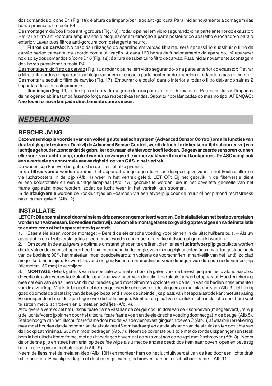 de verticale aslijn van uw kookplaat; let op alle aanwijzingen voor de definitieve plaatsing van het apparaat. Houd er rekening mee dat één van de aslijnen van de mal precies goed moet zitten ten opzichte van de aslijn van de bedieningselementen van de afzuigkap. Maak de beugel met de meegeleverde schroeven en de pluggen aan het plafond vast (Afb. 3); let hierbij goed op omdat de plaatsing van de beugel bepalend is voor de uiteindelijke plaats van het apparaat: de kant met uitsparing B correspondeert met de zijde tegenover de bedieningen. Monteer de plaat van de elektrische installatie door hem vast te zetten met 2 schroeven en 2 metalen schijfjes (Afb. 4). Afzuigversie versie: Zet het uitschuifbare frame vast aan de beugel door middel van de 4 schroeven (meegeleverd), terwijl u de luchtafvoerpijp binnen door het uitschuifbare frame voert en de elektrische voeding door het gat in de beugel (Afb.5). Stel de hoogte van het uitschuifbare frame door middel van de vier bevestigingsschroeven C (Afb. 6) af waarbij u er rekening mee moet houden dat de hoogte van de afzuigkap 45 mm bedraagt en dat de afstand van de afzuigkap ten opzichte van de kookplaat minimaal 650 mm moet bedragen (Afb. 7). Neem de bovenste buis (die met de ronde uitsparingen) en steek hem in het uitschuifbare frame, met de uitsparingen boven; zet de buis vast aan de beugel met 2 schroeven (Afb. 8). Neem de onderste pijp en steek hem erin, op dezelfde wijze als u met de andere deed; doe hem naar boven lopen en bevestig hem in deze positie met plakband (Afb. 9). Neem de flens met de metalen klep (Afb. 10H) en monteer hem op het luchtuitvoergat van de kap door een lichte druk uit te oefenen. Bevestig de kap met de 4 (meegeleverde) schroeven aan het uitschuifbare frame – Afb.11. Door middel van de openingen D (Afb. 11) wordt de luchtafvoerbuis aan de klep H bevestigd. Breng door middel van het elektrische snoer de elektrische aansluiting tot stand. Haal de tape eraf en laat de onderste pijp naar beneden zakken en laat hem voorzichtig op het apparaat steunen. Filtreerversie: Zet het uitschuifbare frame vast aan de beugel met de 4 schroeven (meegeleverd), en laat de elektrische voeding door het gat in de beugel passeren (Afb. 5). Stel de hoogte van het uitschuifbare frame door middel van de vier bevestigingsschroeven C (Afb. 6) af waarbij u er rekening mee moet houden dat de hoogte van de afzuigkap 45 mm bedraagt en dat de afstand van de afzuigkap ten opzichte van de kookplaat minimaal 650 mm moet bedragen (Afb. 7). Doe de luchtgeleideplaat (F) in het frame (Afb.12). Monteer de flens via de openingen E (Afb. 13) op de luchtgeleideplaat (F) en zet de flens (G) met een draaibeweging vast. Maak een flexibele pijp aan de flens (G) vast voor de afvoer van de lucht (Afb. 13). Neem de bovenste buis (die met de ronde uitsparingen) en steek hem in het uitschuifbare frame, met de uitsparingen boven; zet de buis vast aan de beugel met 2 schroeven (Afb. 8). Neem de onderste pijp en steek hem erin, op dezelfde wijze als u met de andere deed; doe hem naar boven lopen en bevestig hem in deze positie met plakband (Afb. 9). Neem de vermindering (Afb. 14L) en monteer hem op de uitgang van de kap, door een lichte druk uit te oefenen. Bevestig de kap met de 4 (meegeleverde) schroeven aan het uitschuifbare frame – Afb.15. Bevestig de luchtafvoerbuis aan de vermindering (L). Breng door middel van het elektrische snoer de elektrische aansluiting tot stand. Haal de tape eraf en laat de onderste pijp naar beneden zakken en laat hem voorzichtig op het apparaat steunen. Montage van het koolstoffilter: draai het glazen paneel door het aan de voorkant van de wasemkap vast te pakken (Afb. 16); verwijder het vetfilter door de vergrendeling naar de achterkant van het apparaat te duwen, en het naar buiten te draaien. Ga verder met het monteren van het koolstoffilter (Afb. 17) door de 2 lipjes van het koolstoffilter in de daarvoor bestemde sleuven te plaatsen en het filter naar de binnenkant van het apparaat te duwen. WERKING BEDIENINGSELEMENTEN (Afb. 18): Toets P1: LICHTEN. Schakelt de lichten in en uit. Toets P2: MOTOR. Activeert/Deactiveert de motor. Activeert de motor op de laatst gebruikte snelheid. Indien de toets meerdere malen wordt ingedrukt wordt de snelheid op cyclische wijze gewijzigd (1, 2, 3, 4, 1, 2....). De ingestelde snelheid wordt weergegeven door icoon D5 en op hetzelfde moment wordt icoon D8 geactiveerd (de snelheid van de draaiende beweging staat in verhouding tot de snelheid). Bij de maximumsnelheid wordt icoon D8 gedeactiveerd en wordt icoon D3 geactiveerd. Om de motor te stoppen drukt u gedurende ongeveer 2 seconden op toets P2 (de ingestelde snelheid wordt bewaard). Toets P3: Selecteer de functies D4 (Sensor) en/of D7 (Air Refresh). Toets P4: Reset vetfilters en/of koolstoffilters. Icoon D1: ANTI-VETFILTERS. Gaat branden wanneer het tijd is het/de vetfilter/s te reinigenen (na ongeveer 30 uur werking van de kap). Nadat het vetfilter/de vetfilters schoongemaakt is/zijn, moet op de toets P4 worden gedrukt om de urentelling opnieuw te laten starten. Icoon D3: MAXIMUMSNELHEID. Wordt alleen geactiveerd indien de maximumsnelheid is ingesteld. Icoon D4: SENSOR. Druk op de toets P4 om de sensorfunctie te activeren. Om de sensor te deactiveren herhaalt u dezelfde handelingen. Wanneer de sensor geactiveerd is treedt de kap automatisch in werking bij de aanwezigheid van ongeacht welke geuren, dampen, rook of warmte die veroorzaakt worden door het kookproces en ook bij de aanwezigheid van eventuele en afwijkende lekkages van GAS in de omgeving. Iconen D5 en D6: DISPLAY. Geeft de ingestelde snelheid weer; geeft de gevoeligheid van de sensor weer. Icoon D7: AIR REFRESH. Om de Air Refresh-functie in te schakelen, druk op de toets P3 totdat het symbool D7 begint te knipperen. Om de Air Refresh-functie uit te schakelen, druk op de toets P3 totdat het symbool D7 uitgaat. De Air Refresh functie wordt alleen geactiveerd indien de motor niet in werking is