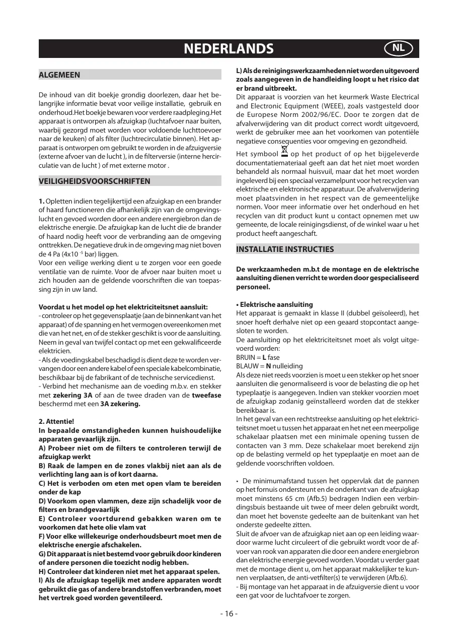 L) Als de reinigingswerkzaamheden niet worden uitgevoerd zoals aangegeven in de handleiding loopt u het risico dat er brand uitbreekt. Dit apparaat is voorzien van het keurmerk Waste Electrical and Electronic Equipment (WEEE), zoals vastgesteld door de Europese Norm 2002/96/EC. Door te zorgen dat de afvalverwijdering van dit product correct wordt uitgevoerd, werkt de gebruiker mee aan het voorkomen van potentiële negatieve consequenties voor omgeving en gezondheid. Het symbool op het product of op het bijgeleverde documentatiemateriaal geeft aan dat het niet moet worden behandeld als normaal huisvuil, maar dat het moet worden ingeleverd bij een speciaal verzamelpunt voor het recyclen van elektrische en elektronische apparatuur. De afvalverwijdering moet plaatsvinden in het respect van de gemeentelijke normen. Voor meer informatie over het onderhoud en het recyclen van dit product kunt u contact opnemen met uw gemeente, de locale reinigingsdienst, of de winkel waar u het product heeft aangeschaft. INSTALLATIE INSTRUCTIES De werkzaamheden m.b.t de montage en de elektrische aansluiting dienen verricht te worden door gespecialiseerd personeel.