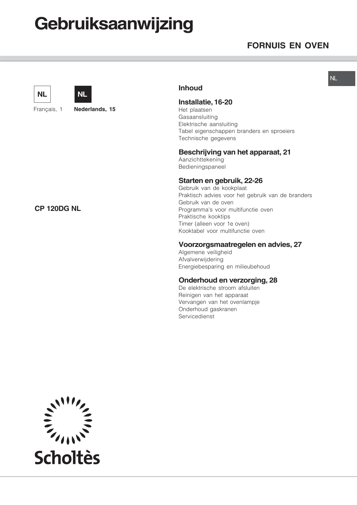 Vind de handleiding van het apparaat gratis CP 120DG NL SCHOLTES in PDF-formaat.