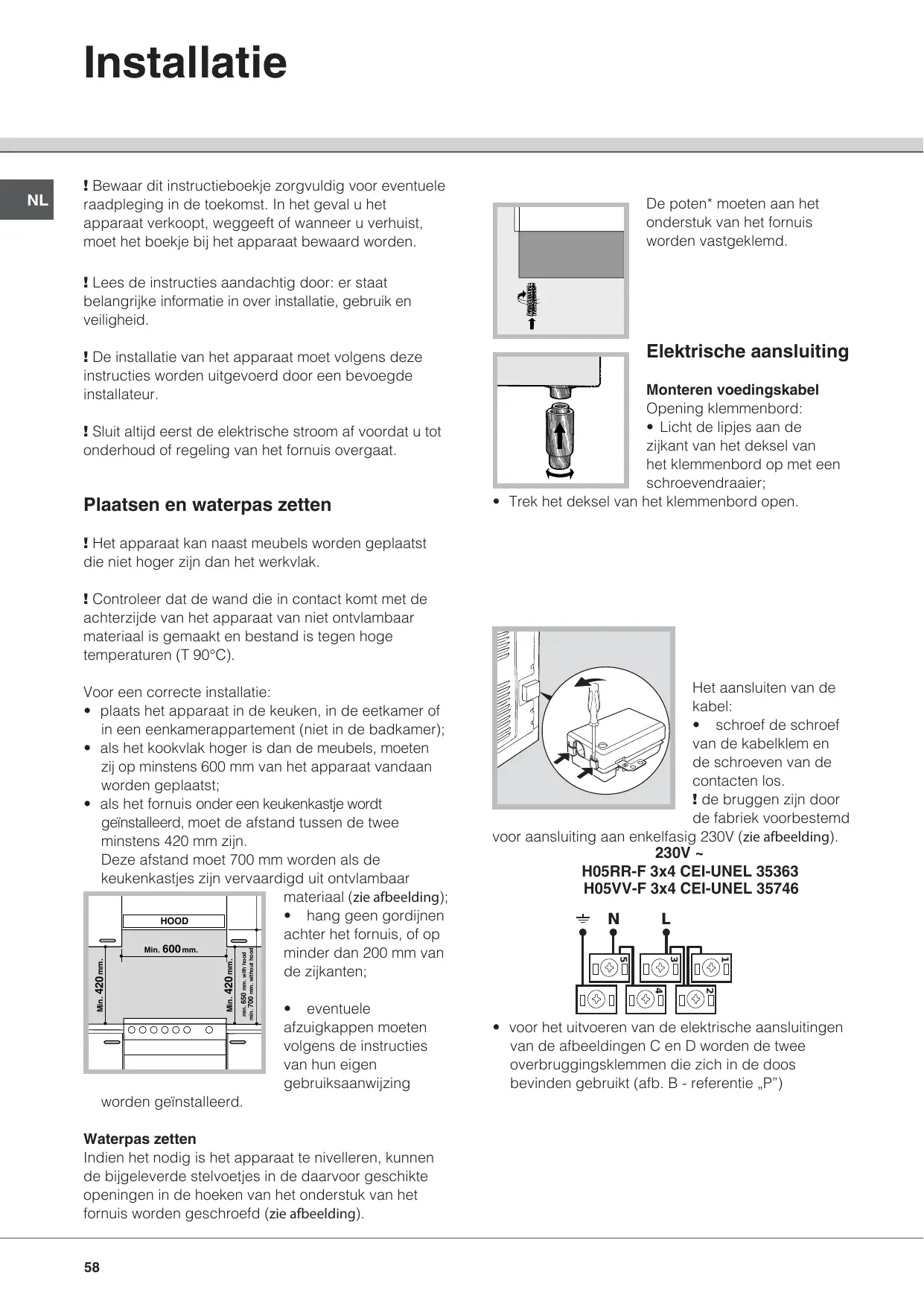 Installatie ! Bewaar dit instructieboekje zorgvuldig voor eventuele raadpleging in de toekomst. In het geval u het apparaat verkoopt, weggeeft of wanneer u verhuist, moet het boekje bij het apparaat bewaard worden. De poten* moeten aan het onderstuk van het fornuis worden vastgeklemd. ! Lees de instructies aandachtig door: er staat belangrijke informatie in over installatie, gebruik en veiligheid. ! De installatie van het apparaat moet volgens deze instructies worden uitgevoerd door een bevoegde installateur. ! Sluit altijd eerst de elektrische stroom af voordat u tot onderhoud of regeling van het fornuis overgaat. Plaatsen en waterpas zetten Elektrische aansluiting Monteren voedingskabel Opening klemmenbord: