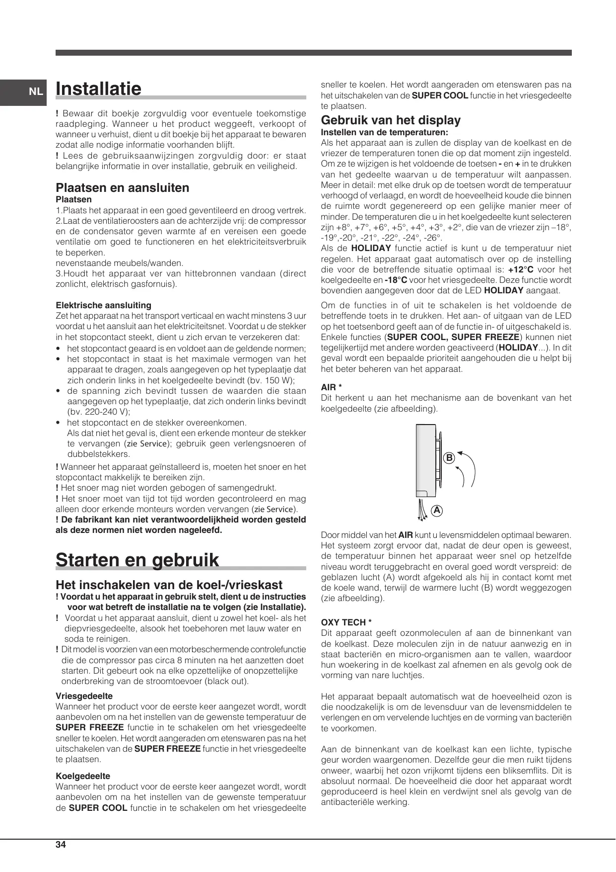 Door middel van het AIR kunt u levensmiddelen optimaal bewaren. Het systeem zorgt ervoor dat, nadat de deur open is geweest, de temperatuur binnen het apparaat weer snel op hetzelfde niveau wordt teruggebracht en overal goed wordt verspreid: de geblazen lucht (A) wordt afgekoeld als hij in contact komt met de koele wand, terwijl de warmere lucht (B) wordt weggezogen (zie afbeelding). OXY TECH * Dit apparaat geeft ozonmoleculen af aan de binnenkant van de koelkast. Deze moleculen zijn in de natuur aanwezig en in staat bacteriën en micro-organismen aan te vallen, waardoor hun woekering in de koelkast zal afnemen en als gevolg ook de vorming van nare luchtjes. Het apparaat bepaalt automatisch wat de hoeveelheid ozon is die noodzakelijk is om de levensduur van de levensmiddelen te verlengen en om vervelende luchtjes en de vorming van bacteriën te voorkomen. Aan de binnenkant van de koelkast kan een lichte, typische geur worden waargenomen. Dezelfde geur die men ruikt tijdens onweer, waarbij het ozon vrijkomt tijdens een bliksemflits. Dit is absoluut normaal. De hoeveelheid die door het apparaat wordt geproduceerd is heel klein en verdwijnt snel als gevolg van de antibacteriële werking. Het mechanisme wordt ingeschakeld door op de speciale toets van het bedieningspaneel te drukken (amberkleurige led). Als de Active Oxygen functie actief is, zal het apparaat regelmatig (en herhaaldelijk totdat de functie weer wordt uitgeschakeld) Ozon verspreiden. Dit zal worden aangegeven door het aangaan van de groen led op het apparaat in het koelgedeelte, en door een stand-by cyclus (zonder dat er Ozon wordt verspreid), die wordt aangegeven door de blauwe led. Optimaal gebruik van de koelkast