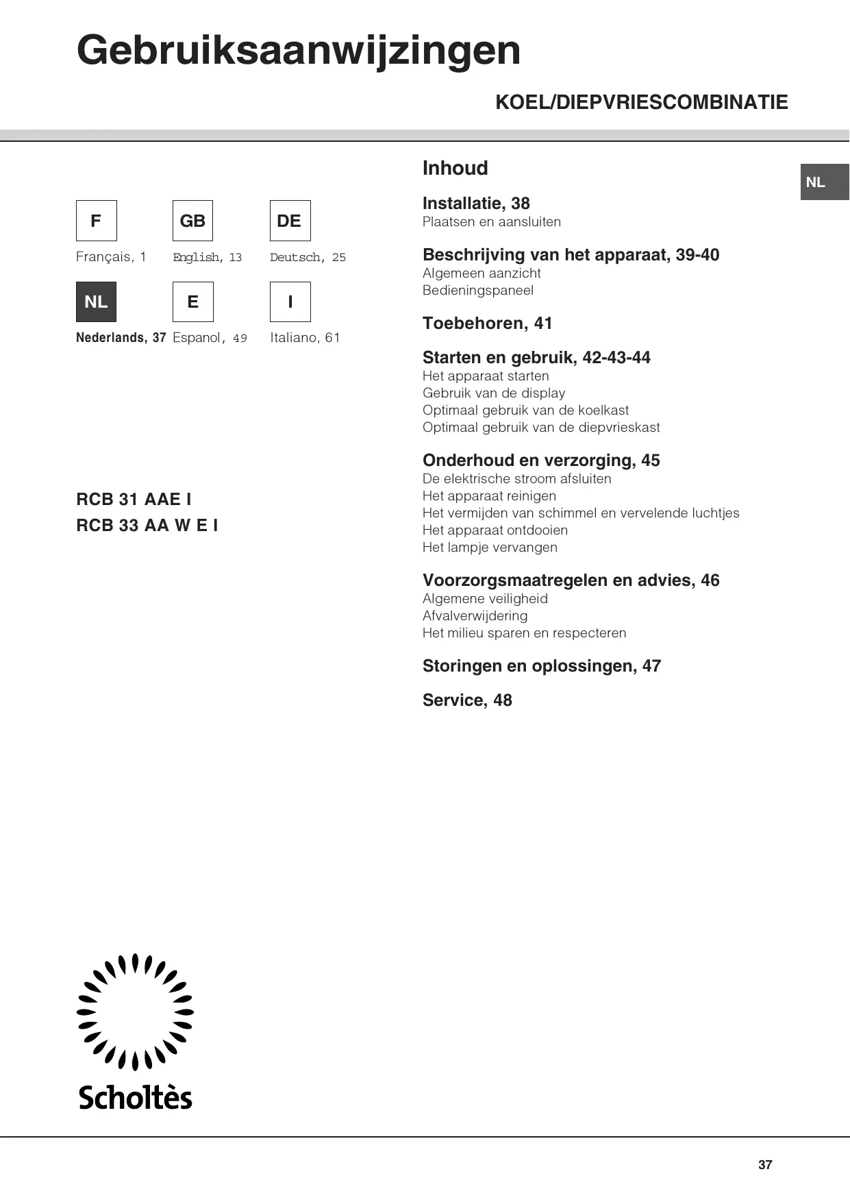 Installatie, 38 Plaatsen en aansluiten Beschrijving van het apparaat, 39-40 Algemeen aanzicht Bedieningspaneel Toebehoren, 41 Starten en gebruik, 42-43-44 Het apparaat starten Gebruik van de display Optimaal gebruik van de koelkast Optimaal gebruik van de diepvrieskast Onderhoud en verzorging, 45