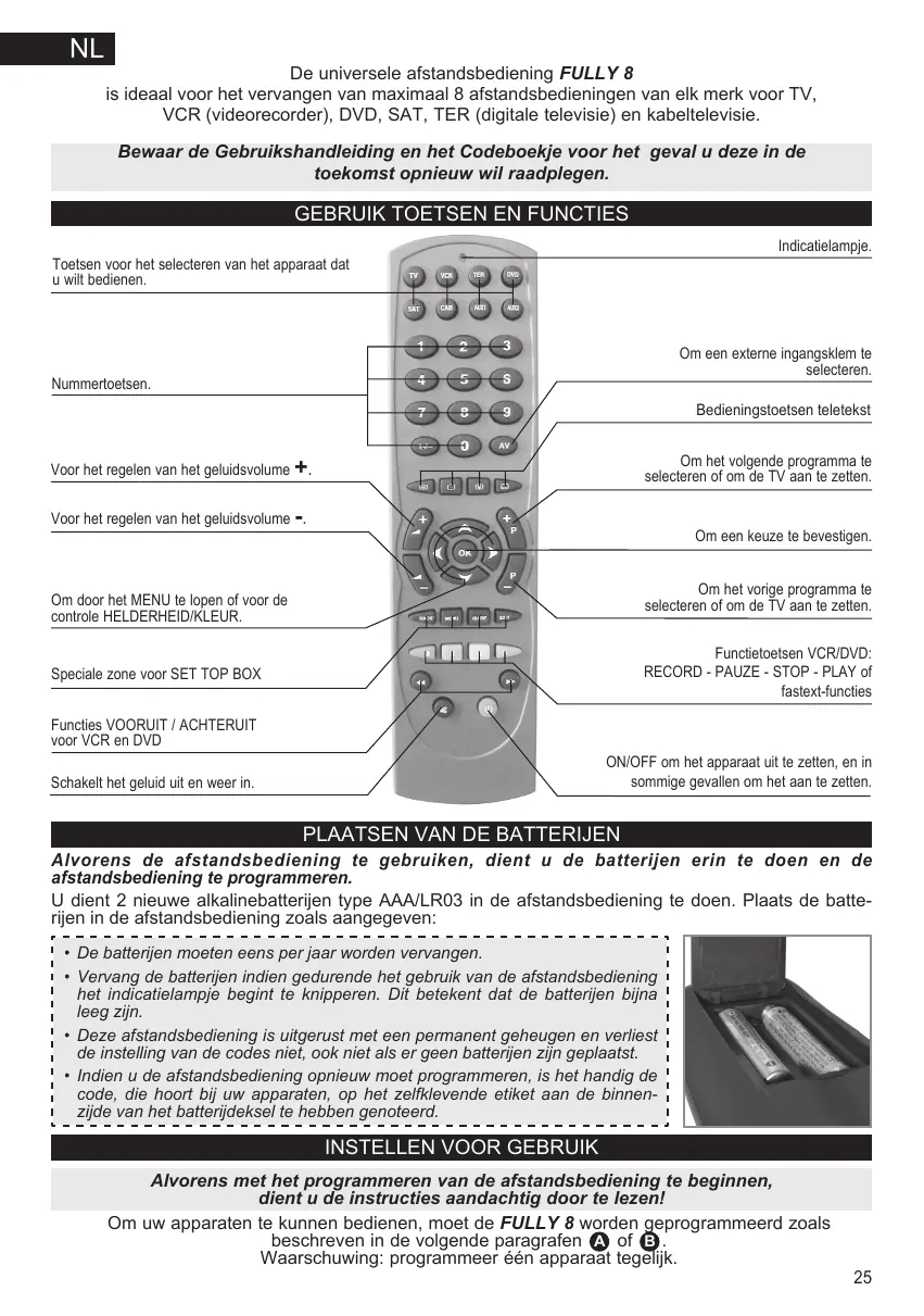 De universele afstandsbediening FULLY 8 is ideaal voor het vervangen van maximaal 8 afstandsbedieningen van elk merk voor TV, VCR (videorecorder), DVD, SAT, TER (digitale televisie) en kabeltelevisie. Bewaar de Gebruikshandleiding en het Codeboekje voor het geval u deze in de toekomst opnieuw wil raadplegen.