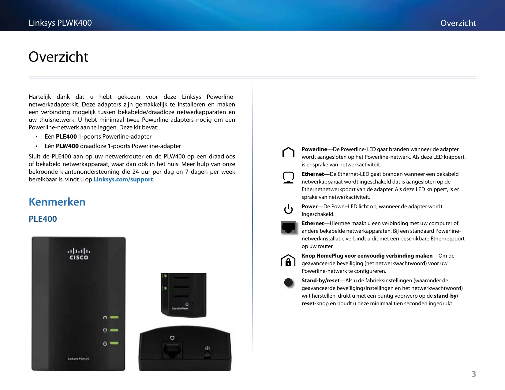 Download de handleiding voor uw Powerline-adapter in PDF-formaat gratis! Vind uw handleiding PLWK400 - LINKSYS en neem uw elektronisch apparaat weer in handen. Op deze pagina staan alle documenten die nodig zijn voor het gebruik van uw apparaat. PLWK400 van het merk LINKSYS.