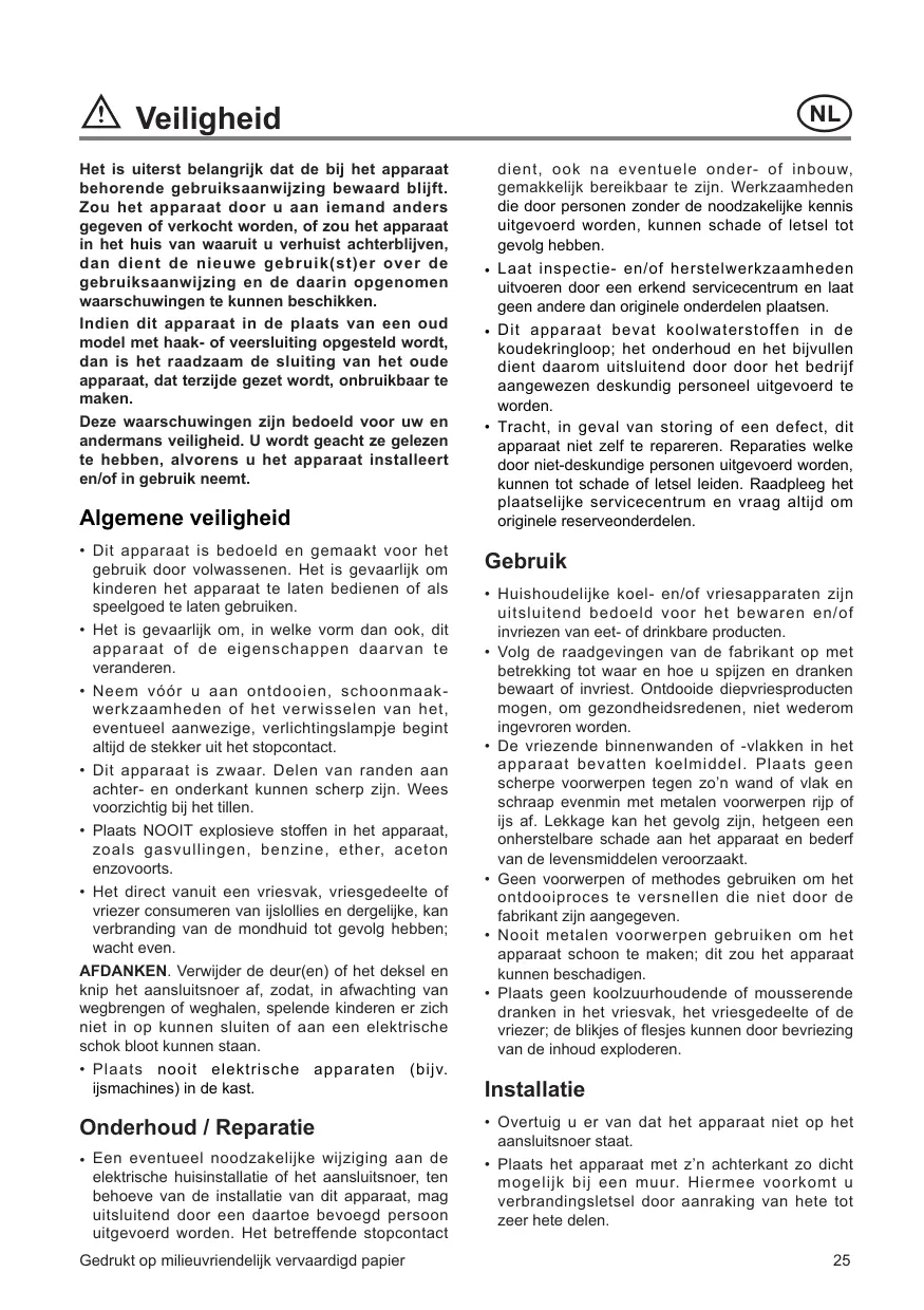 Cette dŽclaration ne porte pas atteinte aux obligations de garantie du vendeur envers lÕutilisateur final. LÕappareil est garanti dans le cadre et dans le respect des conditions suivantes : 1 Compte tenu des dispositions stipulŽes aux paragraphes 2 ˆ 15, nous remŽdierons sans frais ˆ toute dŽfectuositŽ qui se manifeste au cours de la pŽriode de 24 mois ˆ compter de la date de livraison de lÕappareil au premier consommateur final. Ces conditions de garantie ne sont pas dÕapplication en cas dÕutilisation ˆ des fins professionnelles ou de fa•on Žquivalente. 2 La prestation sous garantie implique que lÕappareil est remis dans lÕŽtat quÕil avait avant que la dŽfectuositŽ ne survienne. Les composants dŽfectueux sont remplacŽs ou rŽparŽs. Les composants remplacŽs sans frais deviennent notre propriŽtŽ. 3 Afin dÕŽviter des dommages plus sŽv•res, la dŽfectuositŽ doit immŽdiatement •tre portŽe ˆ notre connaissance. 4 LÕapplication de la garantie est soumise ˆ la production par le consommateur des preuves dÕachat avec la date dÕachat et/ou la date de livraison. 5 La garantie nÕinterviendra pas si des dommages causŽs ˆ des pi•ces dŽlicates, telles que le verre (vitrocŽramique), les mati•res synthŽtiques et le caoutchouc, rŽsultent dÕune mauvaise utilisation. 6 Il ne peut pas •tre fait appel ˆ la garantie pour des anomalies bŽnignes qui nÕaffectent pas la valeur et la soliditŽ gŽnŽrales de lÕappareil. 7 LÕobligation de garantie perd ses effets lorsque les dŽfectuositŽs sont causŽes par: ¥ une rŽaction chimique ou Žlectrochimique provoquŽe par lÕeau, ¥ des conditions environnementales anormales en gŽnŽral, ¥ des conditions de fonctionnement inadaptŽes, ¥ un contact avec des produits agressifs. 8 La garantie ne sÕapplique pas pour les dŽfectuositŽs, dues au transport, survenues en dehors de notre responsabilitŽ. Celles causŽes par une installation ou un montage inadŽquat, par un manque dÕentretien, ou par le non-respect des indications de montage et dÕutilisation, ne seront pas davantage couvertes par la garantie. 9 Ne sont pas couvertes par la garantie, les dŽfectuositŽs qui proviennent de rŽparations ou dÕ interventions pratiquŽes par des personnes non qualifiŽes ou incompŽtentes, ou qui ont pour cause lÕadjonction dÕaccessoires ou de pi•ces de rechange non dÕorigine. 10 Les appareils aisŽment transportables doivent •tre dŽlivrŽs ou envoyŽs au service client•le. Les interventions ˆ domicile ne peuvent sÕentrevoir que pour des appareils volumineux ou pour des appareils encastrables. 11 Si des appareils sont encastrŽs, sous-encastrŽs, fixŽs ou suspendus de telle sorte que le retrait et la remise en place de ceux-ci dans leur niche dÕencastrement prennent plus dÕune demi-heure, les frais de prestation qui en dŽcoulent seront portŽs en compte. Les dommages connexes causŽs par ces opŽrations de retrait et de remise en place sont ˆ charge de lÕutilisateur. 12 Si au cours de la pŽriode de garantie, la rŽparation rŽpŽtŽe dÕune m•me dŽfectuositŽ nÕest pas concluante, ou si les frais de rŽparations sont jugŽs disproportionnŽs, le remplacement de lÕappareil dŽfectueux par un autre de m•me valeur peut •tre accompli en concertation avec le consommateur. Dans ce cas nous nous rŽservons le droit de rŽclamer une participation financi•re calculŽe au prorata de la pŽriode dÕutilisation ŽcoulŽe. 13 La rŽparation sous garantie nÕentra”ne pas de prolongation de la pŽriode normale de garantie, ni le dŽpart dÕun nouveau cycle de garantie. 14 Nous octroyons une garantie de douze mois sur les rŽparations, limitŽe ˆ la m•me dŽfectuositŽ. 15 Hormis les cas o• une responsabilitŽ est imposŽe lŽgalement, cette dŽclaration de conditions de garantie exclut toute indemnisation de dommages extŽrieurs ˆ lÕappareil dont le consommateur voudrait faire prŽvaloir les droits. Dans le cas dÕune responsabilitŽ reconnue lŽgalement, la compensation nÕexc•dera pas la valeur dÕachat de lÕappareil. Ces conditions de garantie sont valables uniquement pour des appareils achetŽs et utilisŽs en Belgique. Pour les appareils exportŽs, lÕutilisateur doit dÕabord sÕassurer quÕils satisfont aux conditions techniques (p. ex.: la tension, la frŽquence, les prescriptions dÕinstallation, le type de gaz, etc.) pour le pays concernŽ, et quÕils supportent les conditions climatiques et environnementales locales. Pour les appareils achetŽs ˆ lÕŽtranger, lÕutilisateur doit dÕabord sÕassurer qu Ôils rŽpondent bien aux qualifications requises en Belgique. Des adaptations indispensables ou souhaitŽes ne sont pas couvertes par la garantie et ne sont pas possibles dans tous les cas. Le service client•le se tient ˆ votre disposition, Žgalement apr•s expiration de la pŽriode de garantie.
