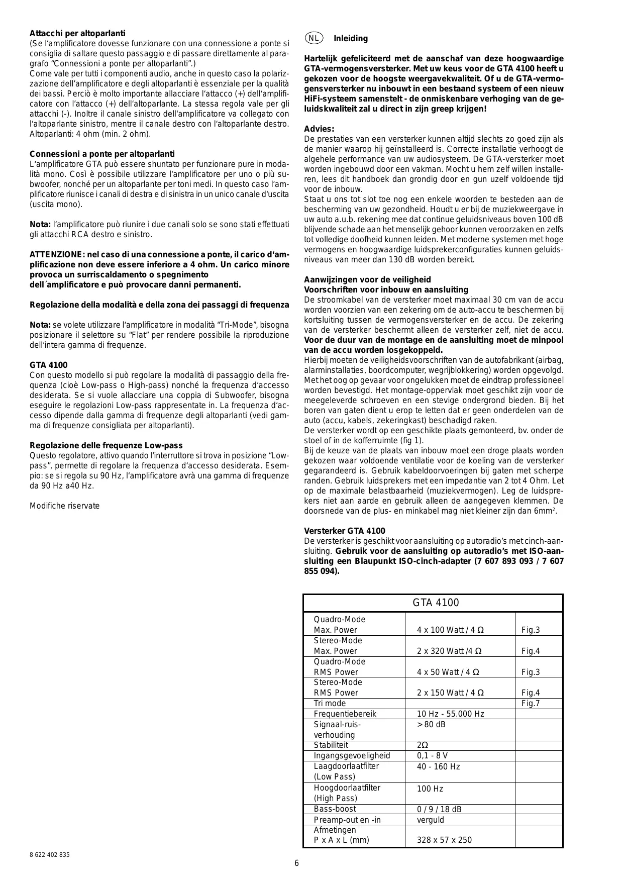 GTA 4100 Quadro-Mode Max. Power 4 x 100 Watt/4 Q Fig.3 Stereo-Mode Max. Power 2 x 320 Watt /4 Q Fig.4 Quadro-Mode RMS Power ax 50 Watt/4Q Fig.3 Stereo-Mode RMS Power 2x 150 Watt/4 Q Fig.4 Trimode Fig.7 Frequentiebereik 10 Hz - 55.000 Hz Signaal-ruis- > 80 dB verhouding Stabiliteit 20 Ingangsgevoeligheid 01-8V Laagdoorlaatfilter 40-160 Hz (Low Pass) Hoogdoorlaatfilter 100 Hz {High Pass) Bass-boost 079718 dE Preamp-out en -in verguld Afmetngen P xA x L (mm) 328 x 57 x 250