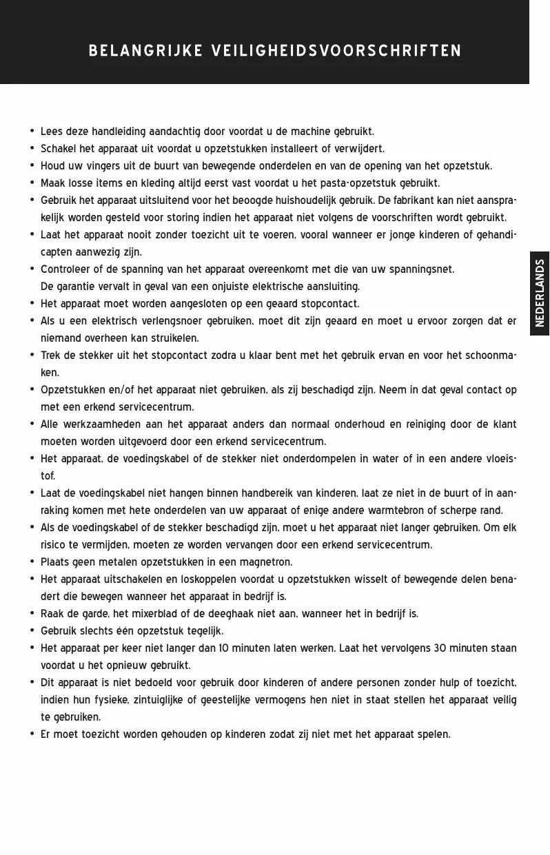 Lees deze handleiding aandachtig door voordat u de machine gebruikt. Schakel het apparaat uit voordat u opzetstukken installeert of verwijdert. Houd uw vingers uit de buurt van bewegende onderdelen en van de opening van het opzetstuk. Maak losse items en kleding altijd eerst vast voordat u het pasta-opzetstuk gebruikt. Gebruik het apparaat uitsluitend voor het beoogde huishoudelijk gebruik. De fabrikant kan niet aansprakelijk worden gesteld voor storing indien het apparaat niet volgens de voorschriften wordt gebruikt. Laat het apparaat nooit zonder toezicht uit te voeren, vooral wanneer er jonge kinderen of gehandicapten aanwezig zijn. Controleer of de spanning van het apparaat overeenkomt met die van uw spanningsnet. De garantie vervalt in geval van een onjuiste elektrische aansluiting. Het apparaat moet worden aangesloten op een geaard stopcontact. Als u een elektrisch verlengsnoer gebruiken, moet dit zijn geaard en moet u ervoor zorgen dat er niemand overheen kan struikelen. Trek de stekker uit het stopcontact zodra u klaar bent met het gebruik ervan en voor het schoonmaken. Opzetstukken en/of het apparaat niet gebruiken, als zij beschadigd zijn. Neem in dat geval contact op met een erkend servicecentrum. Alle werkzaamheden aan het apparaat anders dan normaal onderhoud en reiniging door de klant moeten worden uitgevoerd door een erkend servicecentrum. Het apparaat, de voedingskabel of de stekker niet onderdompelen in water of in een andere vloeistof. Laat de voedingskabel niet hangen binnen handbereik van kinderen, laat ze niet in de buurt of in aanraking komen met hete onderdelen van uw apparaat of enige andere warmtebron of scherpe rand. Als de voedingskabel of de stekker beschadigd zijn, moet u het apparaat niet langer gebruiken. Om elk risico te vermijden, moeten ze worden vervangen door een erkend servicecentrum. Plaats geen metalen opzetstukken in een magnetron. Het apparaat uitschakelen en loskoppelen voordat u opzetstukken wisselt of bewegende delen benadert die bewegen wanneer het apparaat in bedrijf is. Raak de garde, het mixerblad of de deeghaak niet aan, wanneer het in bedrijf is. Gebruik slechts één opzetstuk tegelijk. Het apparaat per keer niet langer dan 10 minuten laten werken. Laat het vervolgens 30 minuten staan voordat u het opnieuw gebruikt. Dit apparaat is niet bedoeld voor gebruik door kinderen of andere personen zonder hulp of toezicht, indien hun fysieke, zintuiglijke of geestelijke vermogens hen niet in staat stellen het apparaat veilig te gebruiken. Er moet toezicht worden gehouden op kinderen zodat zij niet met het apparaat spelen. NEDERLANDS Belangrijke veiligheidsvoorschri ften D e vei l i g h e id va n d e mu ltif u nc t i o ne l e Uwveiligheid en die van anderen is erg belangrijk. we hebben in deze handleiding en op uw toestel tal van belangrijke veiligheidswaarshuwingen aangebracht. Lees deze veiligheidswaarshuwingen steeds, en leef ze na. Dit is het veiligheidsalarmsymbool. Dit symbool waarhuwt u voor mogelijke gevaren waarbij u of anderen gedood of verwond kunnen worden. Alle veiligheidswaarshuwingen staan nahet veiligheidsalarmsymbool en na de woorden “ GEVAAR” of “WAARSCHUWNG” afgedrukt. deze woorden betekenen dat : GEVAAR WAARSCHUWING GEVAAR U gedood of ernstig verwond kunt worden, als u de instructies niet omiddellijk opvogt. Waarschuwing U gedood of ernstig verwond kunt worden, als u de instructies niet opvolgt. Alle veiligheidswaarschuwingen informeren u over het potentiële gevaar, over hoe u het risico op verwondingen kunt verminderen, en wat er kan gebeuren, als u de instructies niet opvolgt. Elektrische vereisten Uw multifunctionele keukenrobot/mixer werkt op een regelmatige 220-240 volt wisselstroom, 50/60hertz huisstroom. Het wattverbruik van onze multifunctionele keukenrobot staat op de sierband gedrukt. Dit wattverbruik wordt bepaald door het hulpstuk dat de meeste stroom nodig heeft. Het is mogelijk dat andere aanbevolen hulpstukken heel wat minder stroom nodig hebben. Gebruik geen verlengsnoer. Is het elektriciteitssnoer te kort, laat dan een gekwalificeerde electricien of monteur in de buurt van het apparaat een stopcontact installeren. WAARSCHUWING Gevaar voor elektrische schokken Steek de stekker in een geaardstopcontact. Randaarde niet verwijderen. Gebruik geen adapter. Gebruik geen verlengsnoer. Het niet opvolgen van deze instructies kan de dood, brand of elektrische schokken tot gevolg hebben. U w ap p a ra at b e d ie n e n Beschrijving