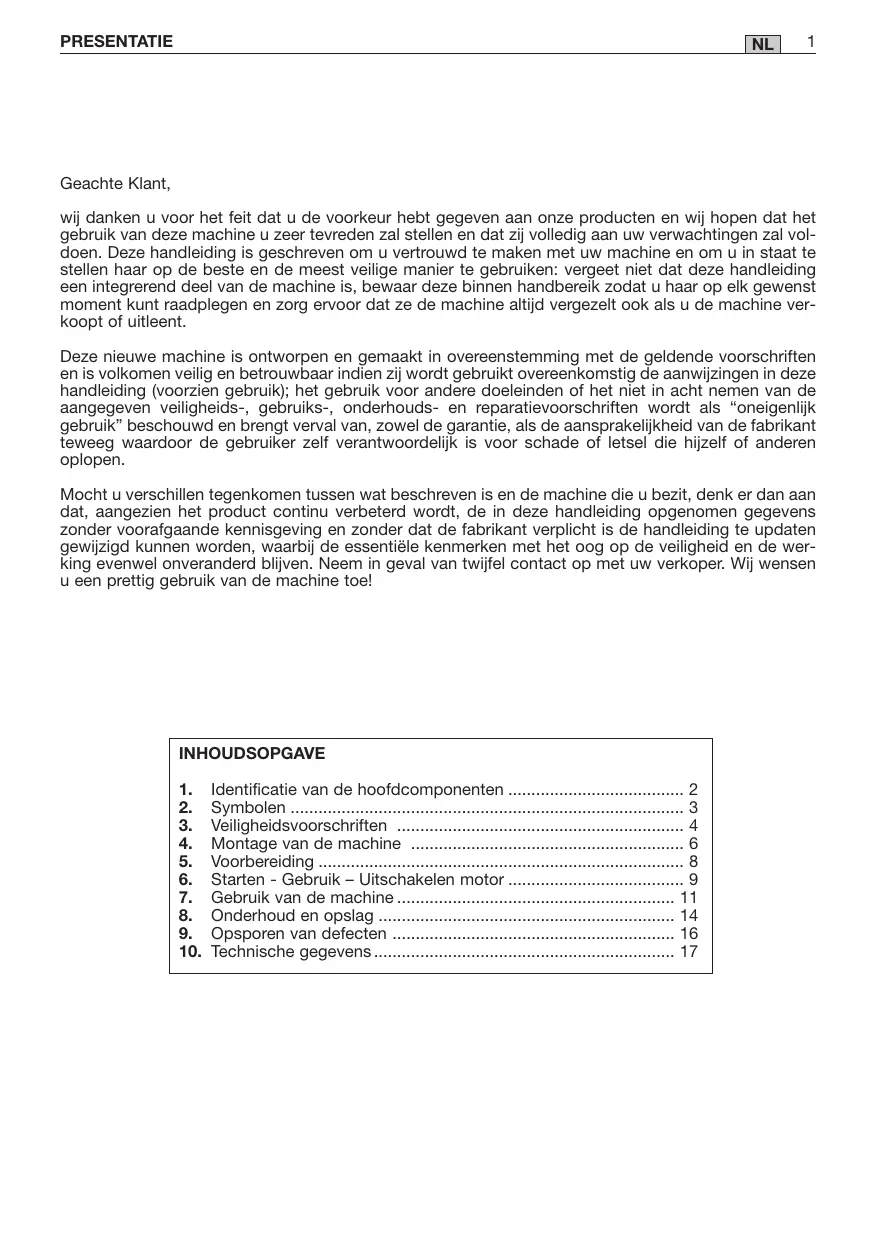 wij danken u voor het feit dat u de voorkeur hebt gegeven aan onsze producten en wij hopen dat het gebruik van deze machine u zeer tevreden zal stellen en dat zij volledig aan uw verwachtingen zal voldoen. Deze handleiding is geschreven om u vertrouwd te makeet met uw machine en om u in staat te stellenhaar op de beste en de meest veilige manier te gebruiken: vergeet Niet dat deze handleiding een integrerend deel van de machine is, bewaar deze binnen handbereik zodat uhaar op elk gewenst moment kunt raadplegen en zorg ervoor dat ze de machine altijd vergezelt ook als u de machine verkoopt of uitleent.
