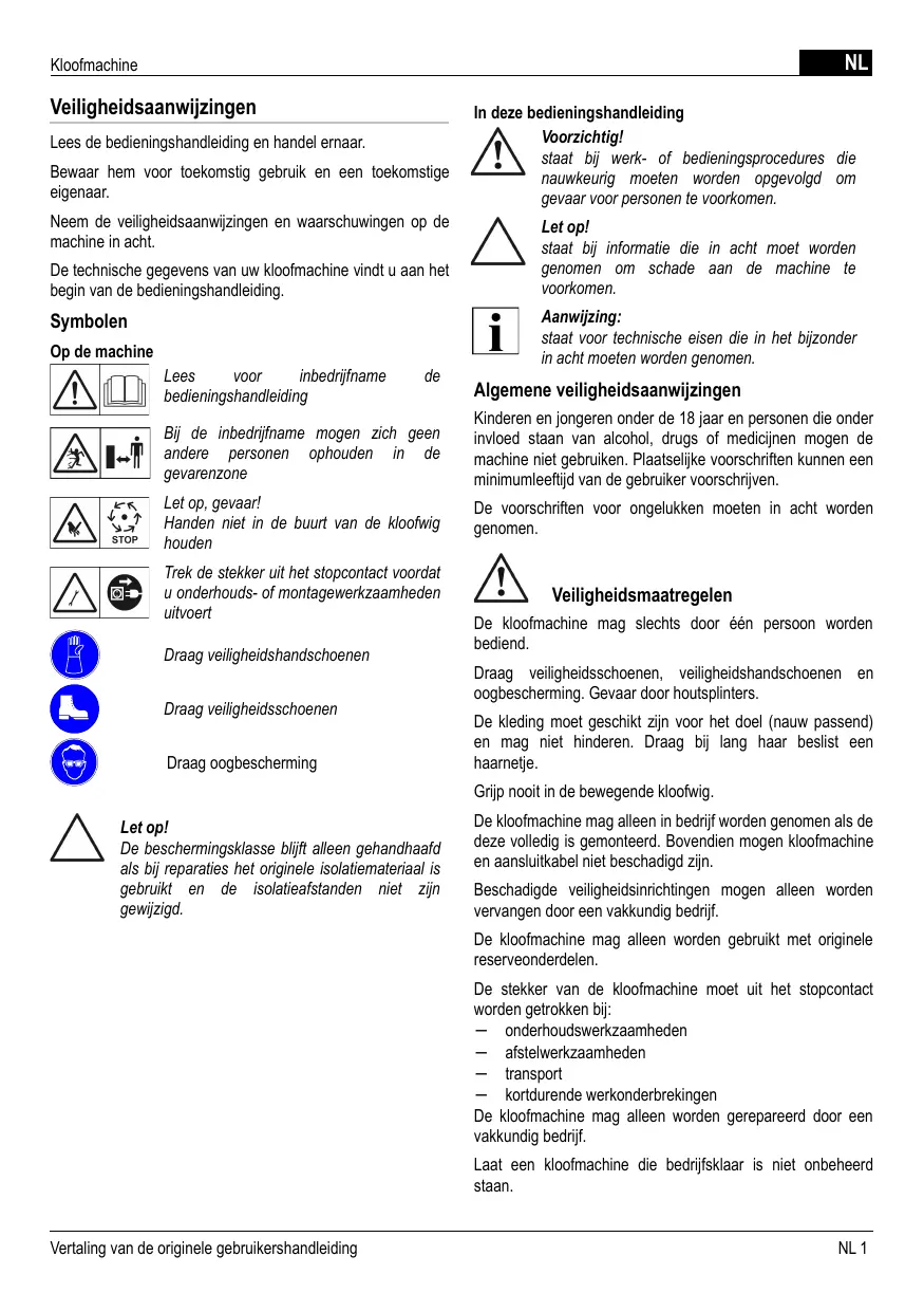 De kloofmachine mag alleen in bedrijf worden genomen als de deze volledig is gemonteerd. Bovendien mogen kloofmachine en aansluitkabel niet beschadigd zijn. Beschadigde veiligheidsinrichtingen mogen alleen worden vervangen door een vakkundig bedrijf. De kloofmachine mag alleen worden gebruikt met originele reserveonderdelen. De stekker van de kloofmachine moet uit het stopcontact worden getrokken bij: − onderhoudswerkzaamheden − afstelwerkzaamheden − transport − kortdurende werkonderbrekingen De kloofmachine mag alleen worden gerepareerd door een vakkundig bedrijf. Laat een kloofmachine die bedrijfsklaar is niet onbeheerd staan.