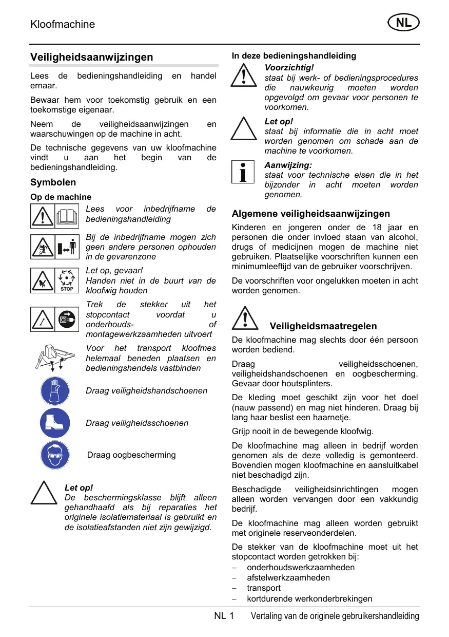 De technische gegevens van uw kloofmachine vindt u aan het begin van de bedieningshandleiding.