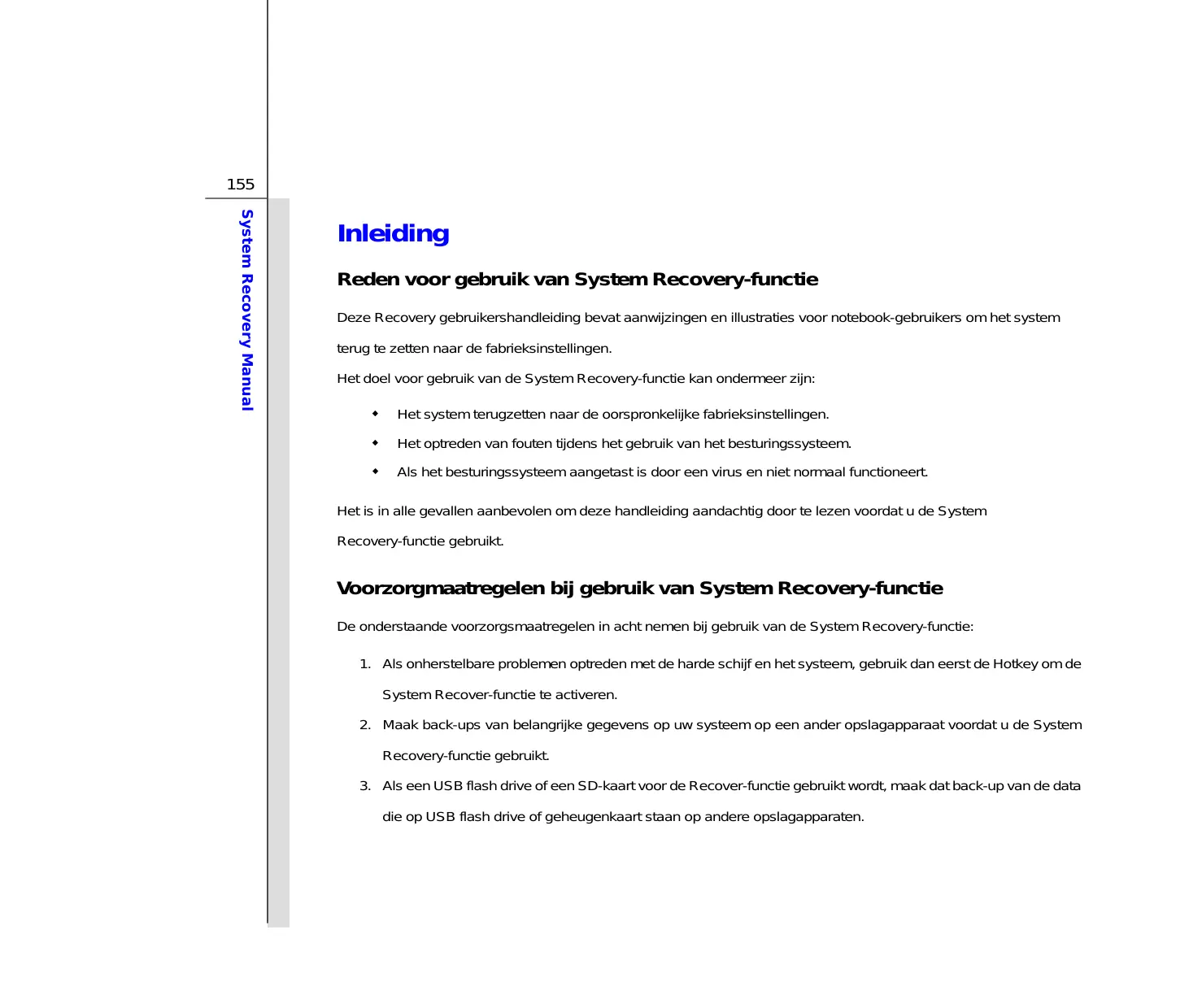 System Recovery Manual Inleiding Reden voor gebruik van System Recovery-functie Deze Recovery gebruikershandleiding bevat aanwijzingen en illustraties voor notebook-gebruikers om het system terug te zetten naar de fabrieksinstellingen. Het doel voor gebruik van de System Recovery-functie kan ondermeer zijn: