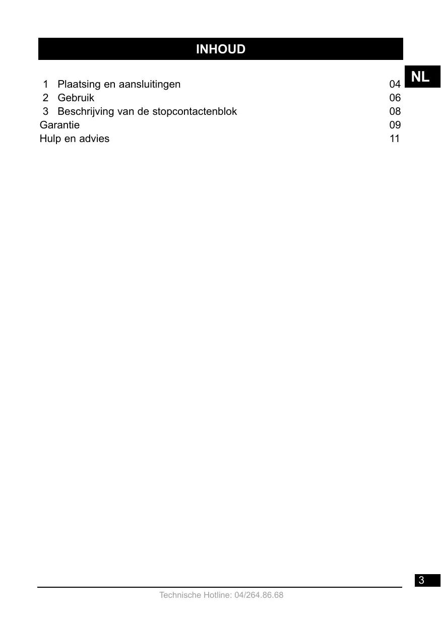 Assistance technique : 0892 350 315 prix d’appel 0,34 € TTC la minute depuis un poste fixe. INHOUD 1 Plaatsing en aansluitingen 2 Gebruik 3 Beschrijving van de stopcontactenblok Garantie Hulp en advies