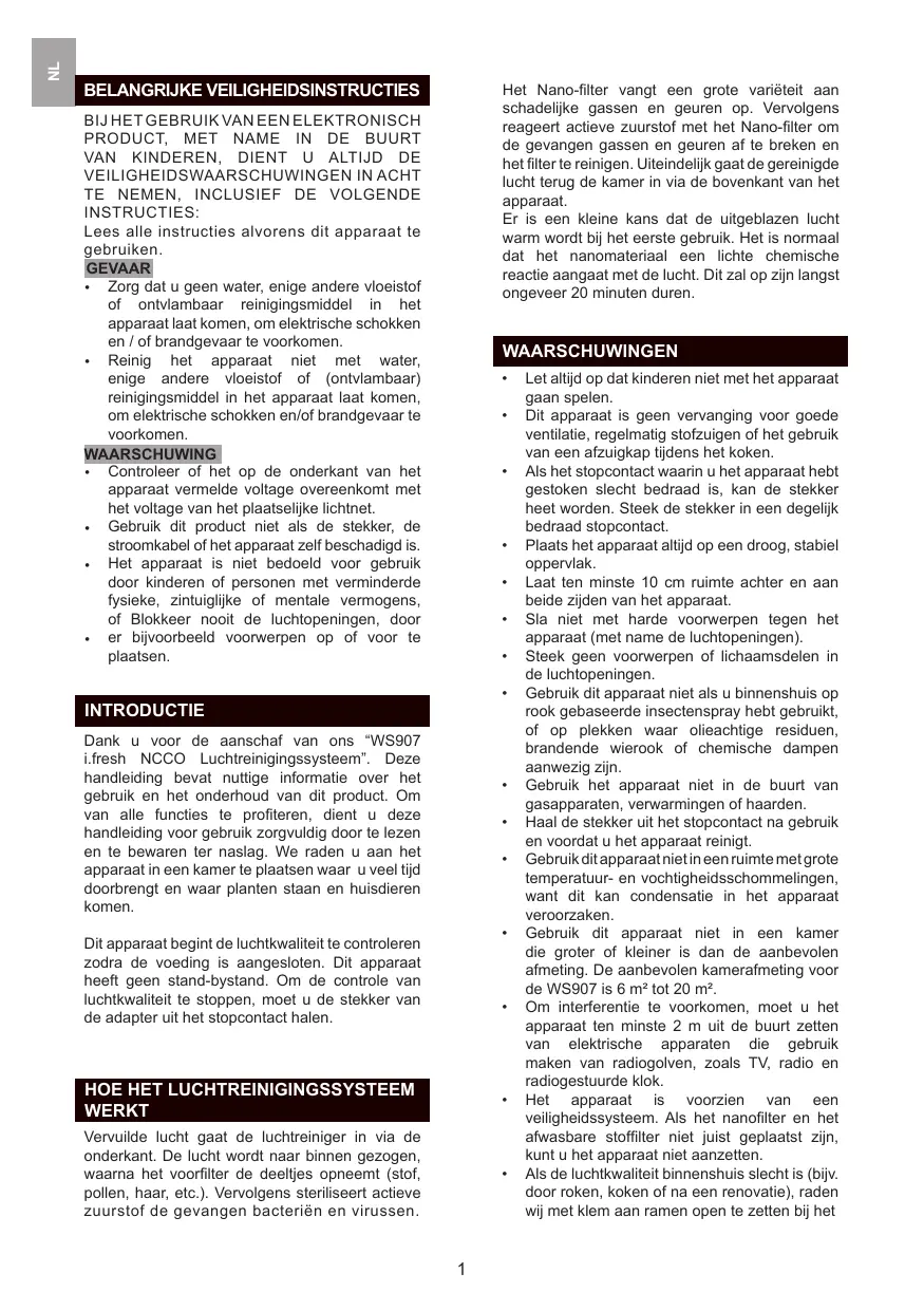 INTRODUCTIE Dank u voor de aanschaf van ons “WS907 i.fresh NCCO Luchtreinigingssysteem”. Deze handleiding bevat nuttige informatie over het gebruik en het onderhoud van dit product. Om van alle functies te profiteren, dient u deze handleiding voor gebruik zorgvuldig door te lezen en te bewaren ter naslag. We raden u aan het apparaat in een kamer te plaatsen waar u veel tijd doorbrengt en waar planten staan en huisdieren komen.
