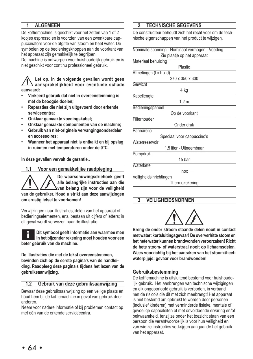 72 TECHNISCHE GEGEVENS De koffiemachine is geschikt voor het zetten van 1 of 2 Kopies espresso en is voorzien van een zwenkbare cap- puccinatore voor de afgifte van stoom en heet water. De symbolen op de bedieningsknoppen aan de voorkant van het apparaat zijn gemakkelik te begripen.