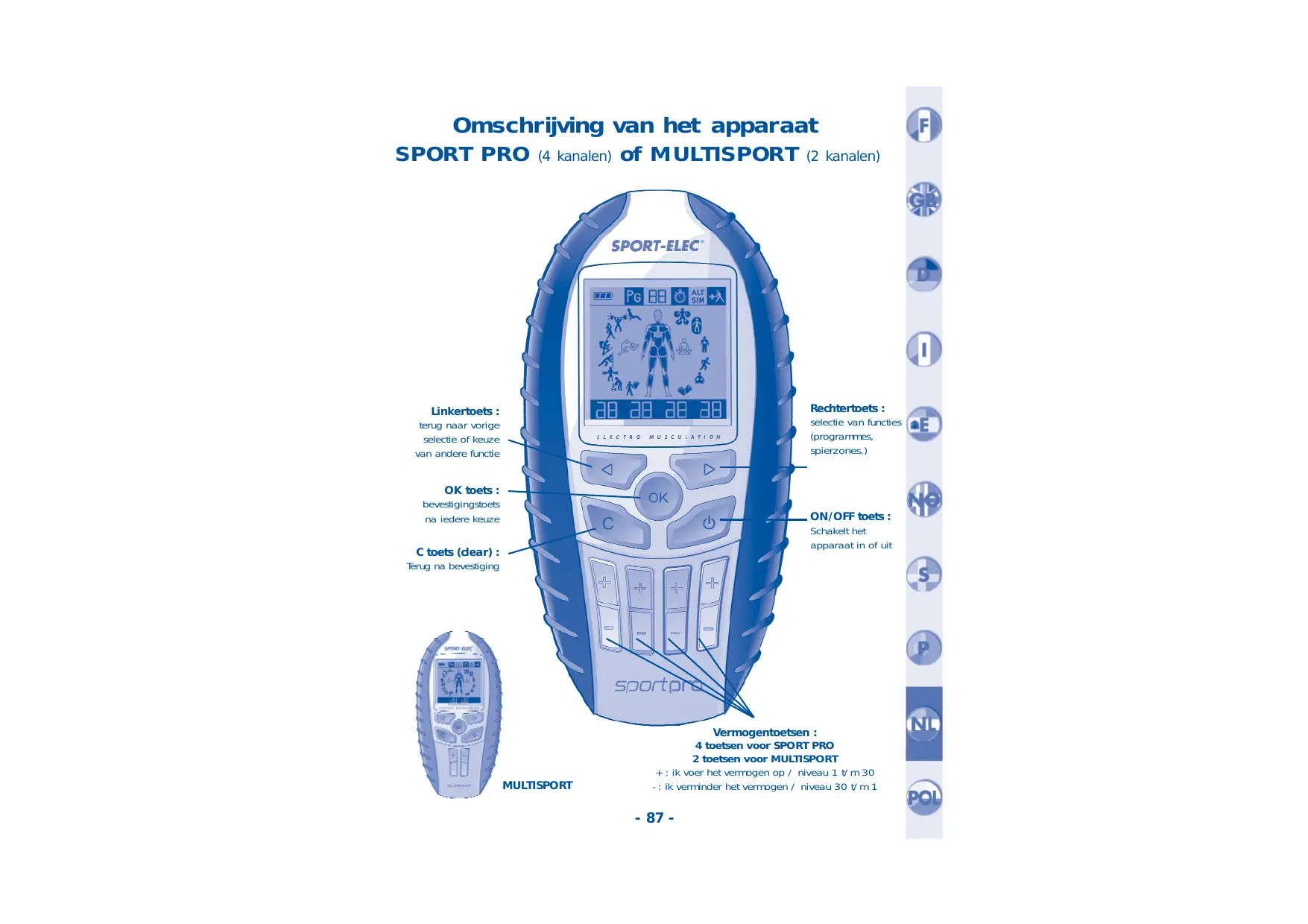 Omschrijving van het apparaat SPORT PRO (4 kanalen) of MULTISPORT (2 kanalen) Rechtertoets : selectie van functies (programmes, spierzones.) Linkertoets : terug naar vorige selectie of keuze van andere functie OK toets : bevestigingstoets na iedere keuze ON/OFF toets : Schakelt het apparaat in of uit C toets (clear) : Terug na bevestiging MULTISPORT Vermogentoetsen : 4 toetsen voor SPORT PRO 2 toetsen voor MULTISPORT + : ik voer het vermogen op / niveau 1 t/m 30 - : ik verminder het vermogen / niveau 30 t/m 1