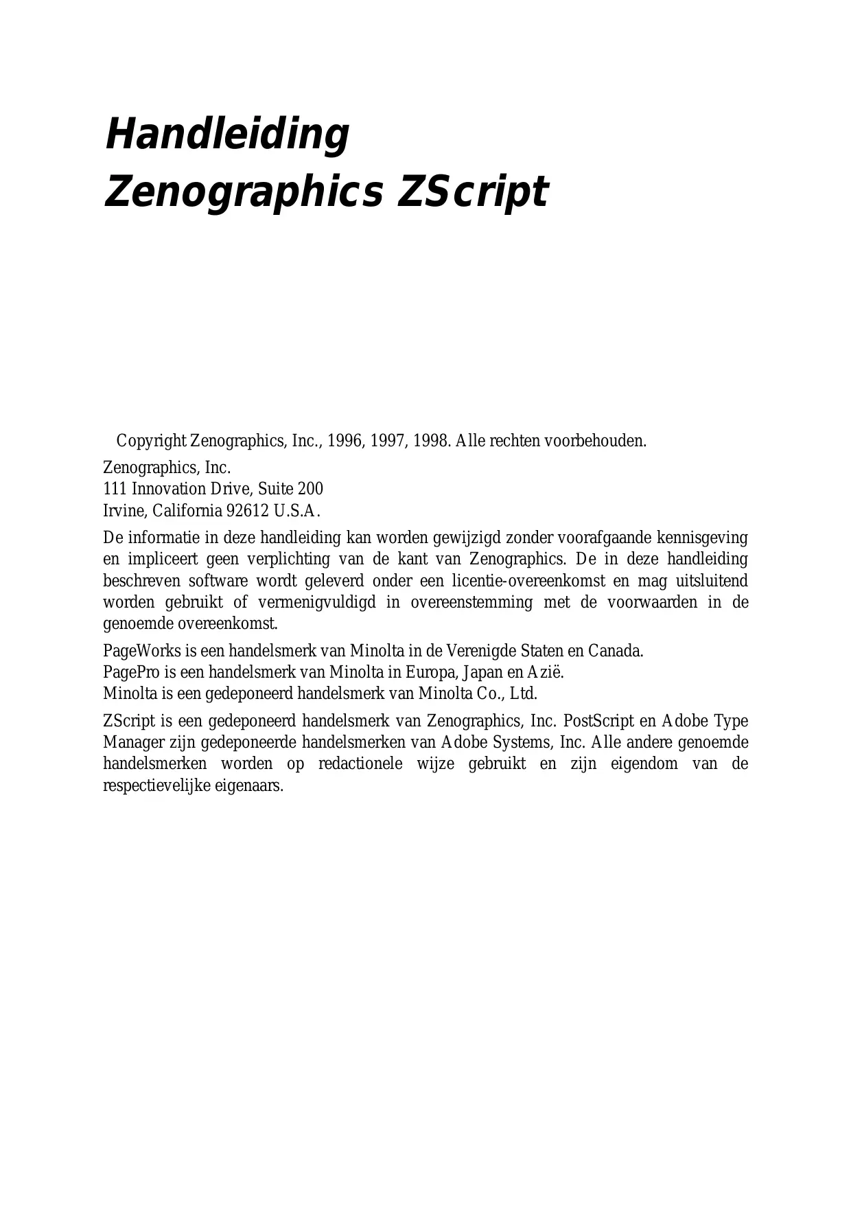 Handleiding Zenographics ZScript Copyright Zenographics, Inc., 1996, 1997, 1998. Alle rechten voorbehouden. Zenographics, Inc. 111 Innovation Drive, Suite 200 Irvine, California 92612 U.S.A. De informatie in deze handleiding kan worden gewijzigd zonder voorafgaande kennisgeving en impliceert geen verplichting van de kant van Zenographics. De in deze handleiding beschreven software wordt geleverd onder een licentie-overeenkomst en mag uitsluitend worden gebruikt of vermenigvuldigd in overeenstemming met de voorwaarden in de genoemde overeenkomst. PageWorks is een handelsmerk van Minolta in de Verenigde Staten en Canada. PagePro is een handelsmerk van Minolta in Europa, Japan en Azië. Minolta is een gedeponeerd handelsmerk van Minolta Co., Ltd. ZScript is een gedeponeerd handelsmerk van Zenographics, Inc. PostScript en Adobe Type Manager zijn gedeponeerde handelsmerken van Adobe Systems, Inc. Alle andere genoemde handelsmerken worden op redactionele wijze gebruikt en zijn eigendom van de respectievelijke eigenaars. Inleiding Aangezien deze handleiding twee versies van Windows 95 en NT 4.0 behandelt, worden deze symbolen gebruikt wanneer een reeks instructies specifiek voor een bepaalde versie is bedoeld. Op deze manier kunt u direct de juiste instructies vinden.
