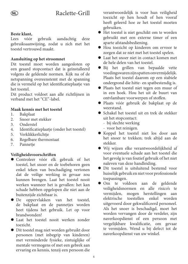 verantwoordelijk is voor hun veiligheid toezicht op hen houdt of hen vooraf heeft geleerd hoe ze het toestel moeten gebruiken. Het toestel is niet geschikt om te worden gebruikt met een externe timer of een aparte afstandsbediening. Hou toezicht op kinderen om ervoor te zorgen dat ze niet met het toestel spelen. Laat het snoer niet in contact komen met de hele delen van het toestel. Bij het grillen van bepaalde vette voedingswaren zijn spatten onvermijdelijk. Plaats het toestel daarom op een stabiele ondergrond die hitte- en spatbestendig is. Plaats het toestel niet tegen een muur of in een hoek. Hou het uit de buurt van ontvlambare voorwerpen of stoffen. Plaats vóór gebruik de bakplaat op de weerstand. Schakel het toestel uit en trek de stekker uit het stopcontact: - bij slechte werking - voor het reinigen. Koppel het toestel niet los door aan het snoer te trekken; trek altijd aan de stekker. Wij wijzen elke verantwoordelijkheid af voor eventuele schade aan het toestel die het gevolg is van foutief gebruik of het niet naleven van deze handleiding. Dit toestel is uitsluitend bestemd voor huiselijk gebruik en niet voor professionele toepassingen. Om te voldoen aan de geldende veiligheidsnormen en alle risico’s te vermijden, mogen herstellingen aan elektrische toestellen enkel worden uitgevoerd door gekwalificeerd personeel. Als het snoer is beschadigd, moet het worden vervangen door de verdeler, zijn naverkoopdienst of een persoon met vergelijkbare kwalificatie, om gevaar te vermijden. Wend u bij defect tot de naverkoopdienst van uw winkel. Werking Nuttige tips – Ontdooi diepgevroren voedingswaren voor u ze gaat grillen. – Gebruik geen schurend, scherp of puntig keukengerei om de voedingswaren om te draaien of van het toestel te nemen: u zou de bekleding van de bakplaat en de pannetjes kunnen beschadigen. – Bakt een grote hoeveelheid voedingswaren, verwijder dan van tijd tot tijd zorgvuldig het overtollige vet. Vóór het eerste gebruik Verwijder al het verpakkingsmateriaal. Reinig vóór het eerste gebruik de bakplaat met een vochtige doek. Het is aan te raden het toestel vóór het eerste gebruik ongeveer 10 minuten zonder voedingswaren te verwarmen. Bij deze eerste ingebruikname kunnen een lichte geur en wat rook vrijkomen. Zorg daarom voor voldoende ventilatie. Wrijf de bakplaat, vóór u er de voedingswaren op legt om te gaan grillen, in met wat frituurolie die bestand is tegen hoge temperaturen. Reiniging en onderhoud z Trek vóór het reinigen altijd de stekker uit het stopcontact en laat het toestel afkoelen. z Reinig het toestel niet met water en dompel het nooit onder om enkel gevaar voor elektrocutie te vermijden. z Gebruik geen agressieve of schurende reinigingsmiddelen. – Wrijf de buitenzijde van het toestel schoon met een niet-pluizende vochtige doek. – Neem de bakplaat uit het toestel. – Reinig de bakplaat en de pannetjes met zeepwater en droog ze zorgvuldig af. Regelbare thermostaat Wanneer de thermostaat op de hoogste stand staat, blijft het verwarmingselement permanent branden; staat hij op een lagere stand, dan zal het verwarmingselement aan en uit gaan. Het verklikkerlichtje blijft branden zolang het verwarmingselement onder spanning staat. Zet de thermostaat na het bakken op de laagste stand en trek de stekker uit het stopcontact. Waarborg Dit toestel is door de fabrikant gedurende een jaar vanaf de aankoopdatum gewaarborgd tegen materiaal- en fabricagefouten. Tijdens deze periode zal elk defect onderdeel gratis worden vervangen. Deze waarborg dekt niet de gewone slijtage van het toestel en breekbare onderdelen zoals glas, lampen, enz., noch schade veroorzaakt door verkeerd gebruik of het niet naleven van de gebruiksaanwijzing. De waarborg is niet van toepassing indien personen die niet door ons zijn goedgekeurd aan het toestel hebben gewerkt voor herstelling of onderhoud. Om van de waarborg te genieten, laat u het certificaat op de verpakking van het toestel invullen en bewaart u het kasticket. Gebruik – Zet het toestel aan en verwarm het ongeveer 10 minuten voor om het op de juiste baktemperatuur te laten komen. – U kunt nu de voedingswaren op de bakplaat leggen. – Leg de kaas in de pannetjes en plaats die in het toestel, onder het verwarmingselement. Wacht tot de kaas gesmolten is. Belangrijk! Plaats nooit lege pannetjes in het toestel wanneer het aan staat. – Trek na gebruik de stekker uit het stopcontact. Het klaarmaken van de kaas Voorzie per persoon ongeveer 200 tot 300 g kaas. Snijd de kaas in plakjes van 3 tot 5 mm dik en doe de plakjes in de pannetjes. We raden u een raclettekaas of een zachte kaas aan.
