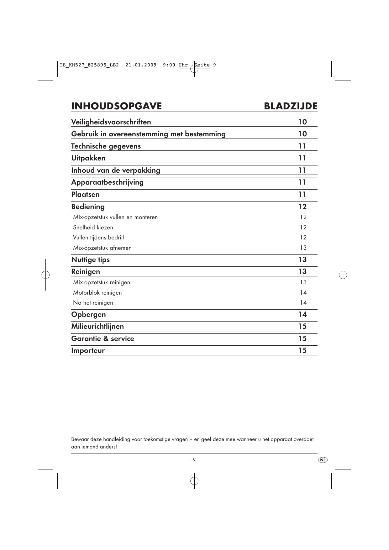 INHOUDSOPGAVE BLADZIJDE Veiligheidsvoorschriften
