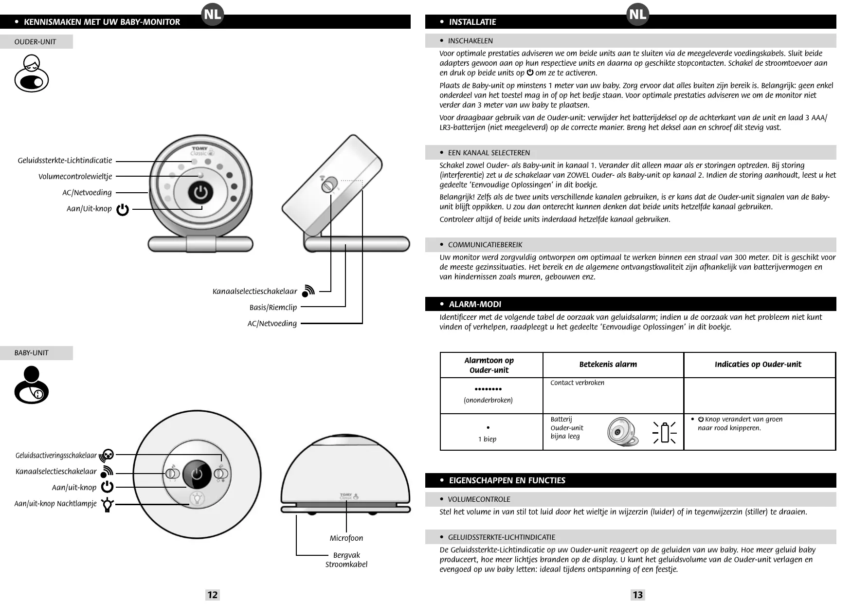 Uw Baby-unit heeft een zacht gloeiend Nachtlampje. Schakel het AAN of UIT door op de knop van uw Baby-unit te drukken. U kunt dit Nachtlampje gebruiken zonder monitoring. Raadpleeg hiervoor het gedeelte ‘Onafhankelijk Nachtlampje’ in dit boekje. De Tomy Baby-Monitor is ontworpen als hulp bij het toezicht op uw kind en vervangt het toezicht door een volwassene niet. Dit product is geen speelgoed. Uw monitor zendt uit over openbare radiogolven. Uw gesprekken kunnen worden opgevangen door andere producten die op dezelfde frequentie werken. Houd elektrische toestellen en hun netsnoeren altijd buiten bereik van baby’s en jonge kinderen. Belangrijk: plaats nooit eender welk onderdeel van uw monitor in of op het bedje. Zorg voor een veilige plaatsing van de bedrading zodat kinderen er niet in verstrikt geraken of erover kunnen struikelen. De adapters die met deze monitor worden meegeleverd, mogen nooit met andere toestellen gebruikt worden. Gebruik voor deze monitor nooit andere dan de meegeleverde adapters. Plaats de adapter nergens waar een kleuter hem als opstapje zou kunnen gebruiken. Gewicht op een ingeplugde adapter kan de unit beschadigen maar kan ook verwondingen veroorzaken. Het is normaal dat laders heet worden tijdens gebruik. Wees voorzichtig; geef hitte de kans zich te verspreiden. NIET AFDEKKEN! Ontkoppel de lader indien het product enkele dagen niet gebruikt wordt. Voorkom elektrische schokken: haal de stekker uit het stopcontact vóór het schoonmaken. Niet weggooien met gewoon afval. Probeer geen onderdelen uit elkaar te halen.