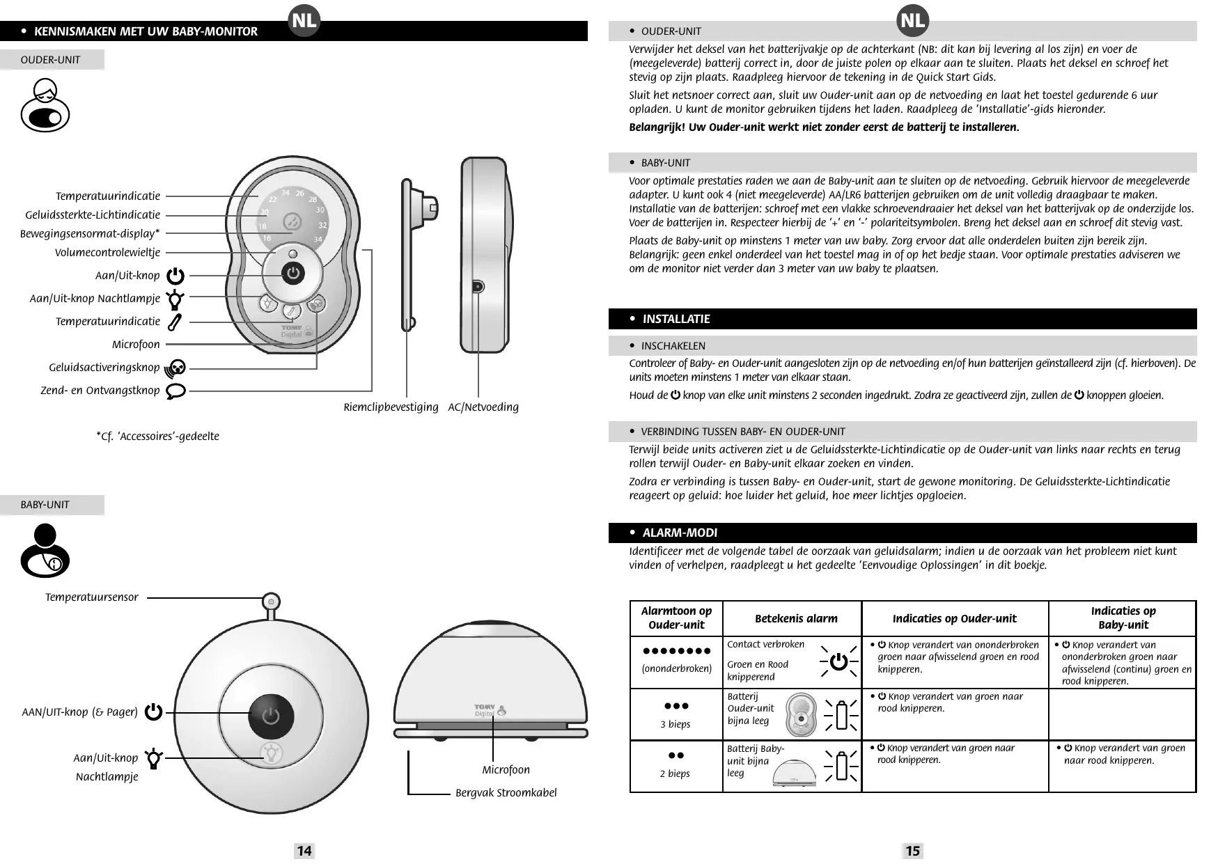 De Tomy Baby-Monitor is ontworpen als hulp bij het toezicht op uw kind en vervangt het toezicht door een volwassene niet. Dit product is geen speelgoed. Houd elektrische toestellen en hun netsnoeren altijd buiten bereik van baby’s en jonge kinderen. Belangrijk: plaats nooit eender welk onderdeel van uw monitor in of op het bedje. Zorg voor een veilige plaatsing van de bedrading zodat kinderen er niet in verstrikt geraken of erover kunnen struikelen. De adapters die met deze monitor worden meegeleverd, mogen nooit met andere toestellen gebruikt worden. Gebruik voor deze monitor nooit andere dan de meegeleverde adapters. Plaats de adapter nergens waar een kleuter hem als opstapje zou kunnen gebruiken. Gewicht op een ingeplugde adapter kan de unit beschadigen maar kan ook verwondingen veroorzaken. Het is normaal dat laders heet worden tijdens gebruik. Wees voorzichtig; geef hitte de kans zich te verspreiden. NIET AFDEKKEN! Ontkoppel de lader indien het product enkele dagen niet gebruikt wordt. Voorkom elektrische schokken: haal de stekker uit het stopcontact vóór het schoonmaken. De oplaadbare batterij in de Ouder-unit moet gerecycleerd worden. Niet weggooien met gewoon afval. Probeer geen onderdelen uit elkaar te halen.