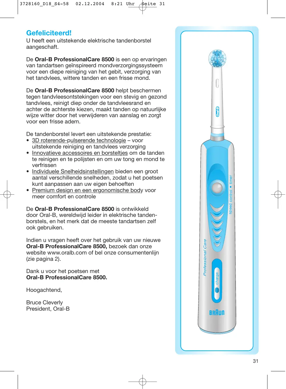 - Premium design en een ergonomische body voor meer comfort en controle Dank u voor het poetsen met Oral-B ProfessionalCare 8500. charge Indien u vragen heeft over het gebruik van uw nieuwe Oral-B ProfessionalCare 8500, bezoek dan onze website www.oralb.com of bel onze consumentenlijn (zie pagina 2). Professional Care De Oral-B ProfessionalCare 8500 is ontwikkeld door Oral-B, wereldwijd leider in elektrische tandenborstels, en het merk dat de meeste tandartsen zelf ook gebruiken. Hoogachtend, Bruce Cleverly President, Oral-B