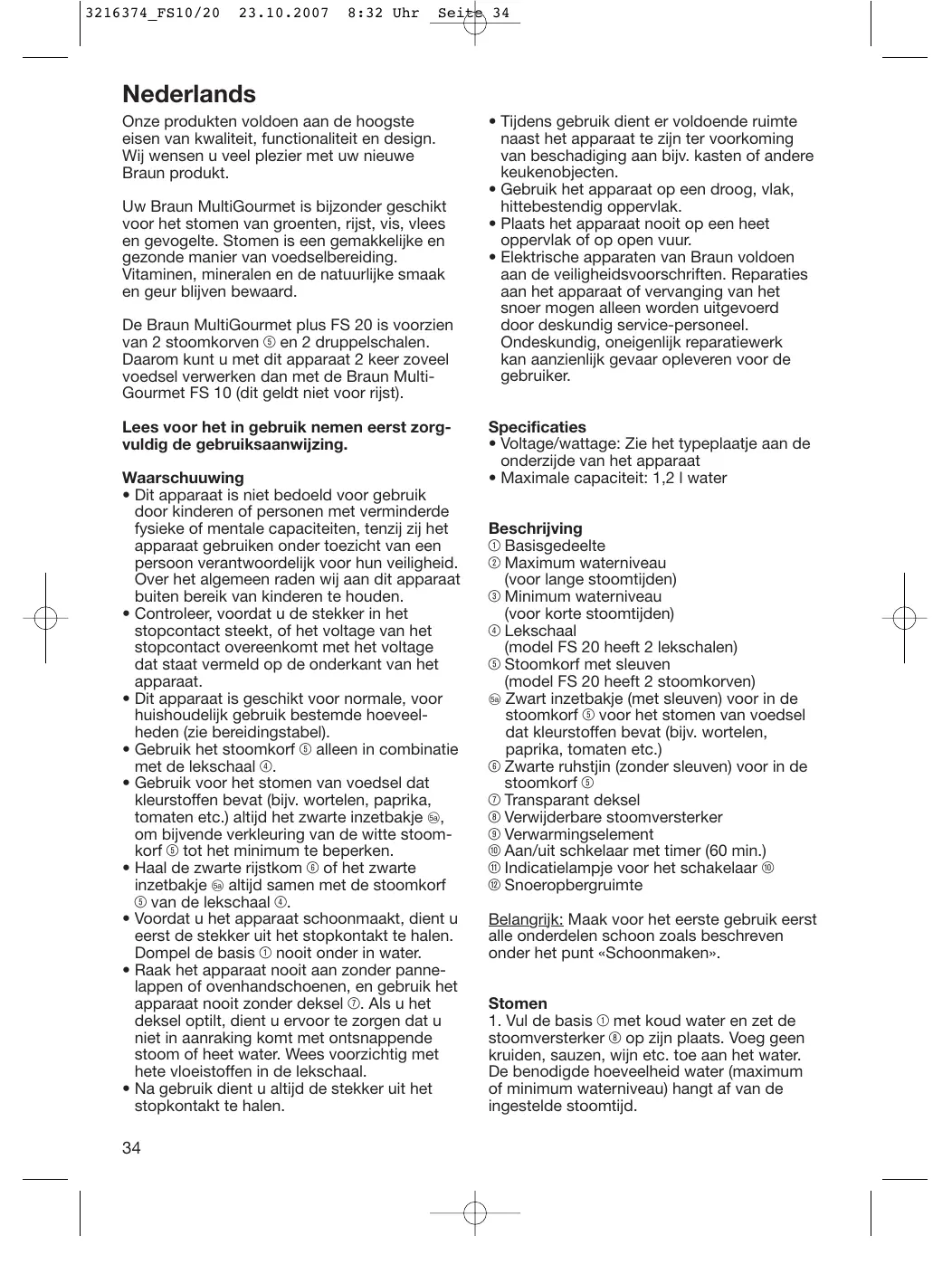 8:32 Uhr Seite 34 Nederlands Onze produkten voldoen aan de hoogste eisen van kwaliteit, functionaliteit en design. Wij wensen u veel plezier met uw nieuwe Braun produkt. Uw Braun MultiGourmet is bijzonder geschikt voor het stomen van groenten, rijst, vis, vlees en gevogelte. Stomen is een gemakkelijke en gezonde manier van voedselbereiding. Vitaminen, mineralen en de natuurlijke smaak en geur blijven bewaard. De Braun MultiGourmet plus FS 20 is voorzien van 2 stoomkorven 5 en 2 druppelschalen. Daarom kunt u met dit apparaat 2 keer zoveel voedsel verwerken dan met de Braun MultiGourmet FS 10 (dit geldt niet voor rijst). Lees voor het in gebruik nemen eerst zorgvuldig de gebruiksaanwijzing. Waarschuuwing