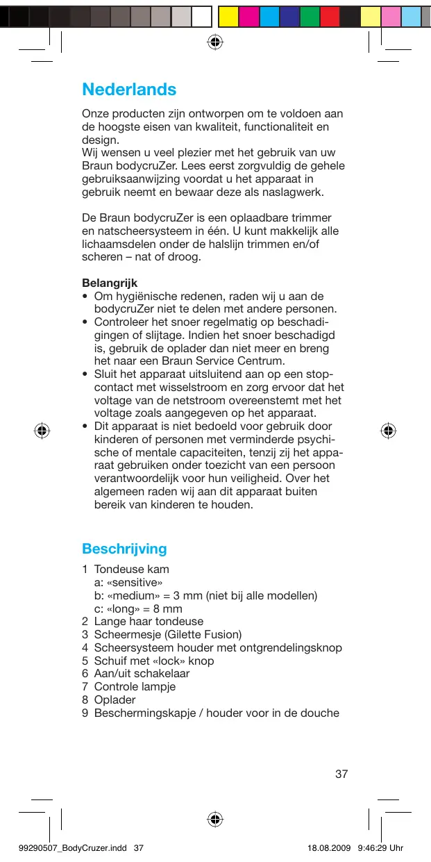 Nederlands Onze producten zijn ontworpen om te voldoen aan de hoogste eisen van kwaliteit, functionaliteit en design. Wij wensen u veel plezier met het gebruik van uw Braun bodycruZer. Lees eerst zorgvuldig de gehele gebruiksaanwijzing voordat u het apparaat in gebruik neemt en bewaar deze als naslagwerk. De Braun bodycruZer is een oplaadbare trimmer en natscheersysteem in één. U kunt makkelijk alle lichaamsdelen onder de halslijn trimmen en/of scheren – nat of droog. Belangrijk