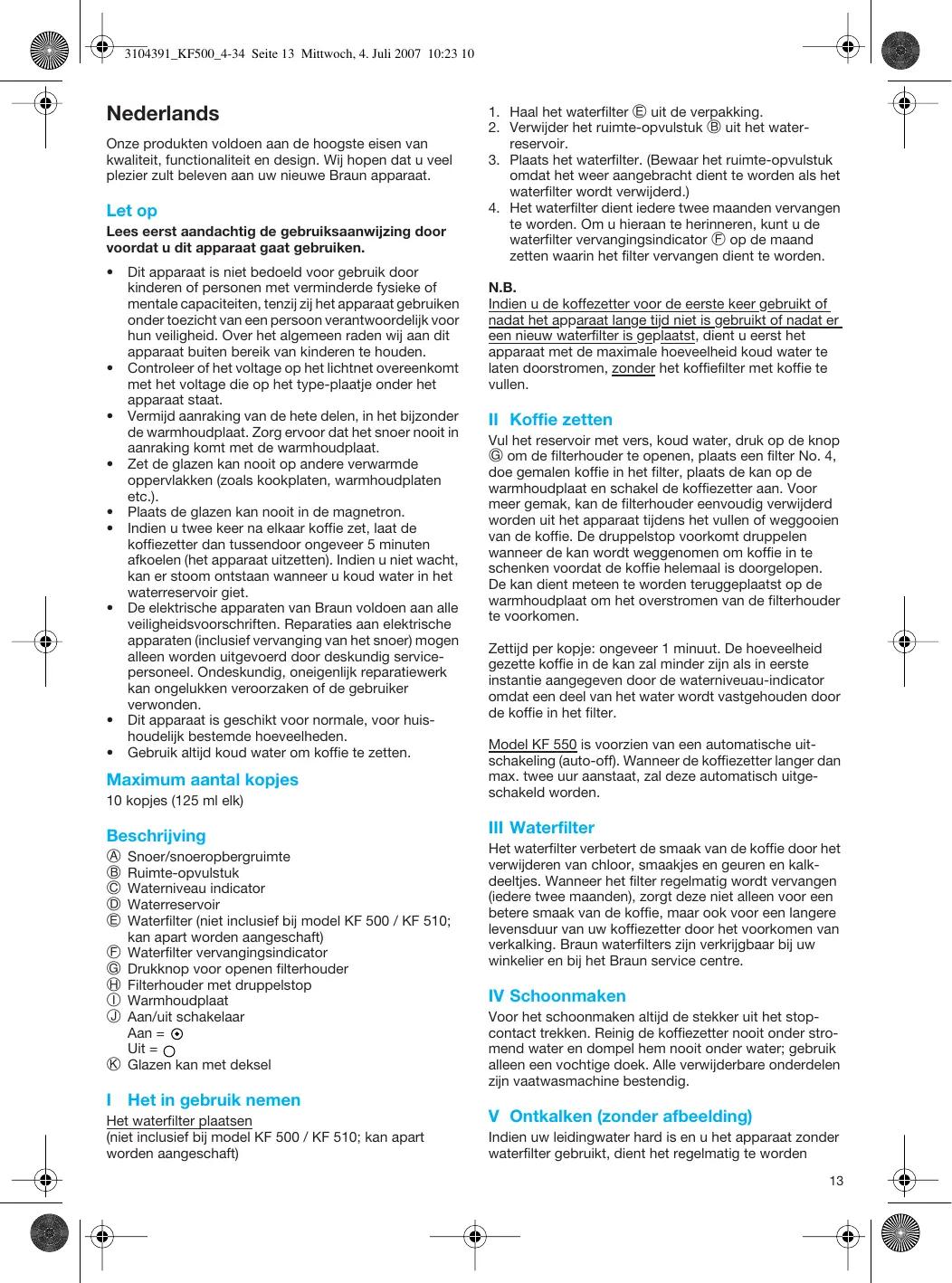 ® 3104391_KFS00 4-34 Scite 13 Mittwoch, 4. Juli 2007 10:23 10 Nederlands Onze produkten voldoen aan de hoogste eisen van kwaliteit, functionaliteit en design. Wij hopen dat u veel plezier zult beleven aan uw nieuwe Braun apparaat. Let op Lees eerst aandachtig de gebruiksaanwijzing door voordat u dit apparaat gaat gebruiken. + Dit apparaat is niet bedoeld voor gebruik door kinderen of personen met verminderde fysieke of mentale capaciteiten, tenzij zi het apparaat gebruiken ondertoezicht van een persoon verantwoordelik voor hun veiligheid. Over het algemeen raden wij aan dit apparaat buiten bereik van kinderen te houden. + Controleer of het voltage op het lichinet overeenkomt met het voltage die op het type-plaatje onder het apparaat staat. + Vermijd aanraking van de hete delen, in het bijzonder de warmhoudplaat. Zorg ervoor dat het snoer nooit in aanraking komt met de warmhoudplaat. +_Zet de glazen kan nooit op andere verwarmde opperviakken (zoals kookplaten, warmhoudplaten etc). +_Plaats de glazen kan nooit in de magnetron. + _ Indien u twee keer na elkaar koffie zet, laat de koffiezetter dan tussendoor ongeveer 5 minuten afkoelen (het apparaat uitzetten). Indien u niet wacht, kan er stoom ontstaan wanneer u koud water in het waterreservoir giet. + De elektrische apparaten van Braun voldoen aan alle veiligheidsvoorschriften. Reparaties aan elektrische apparaten (inclusief vervanging van het snoer) mogen alleen worden uitgevoerd door deskundig service- personeel. Ondeskundig, oneigentijk reparatiewerk kan ongelukken veroorzaken of de gebruiker verwonden. + _Dit apparaat is geschikt voor normale, voor huis- houdelik bestemde hoeveelheden. + Gebruik altid koud water om koffie te zetten. Maximum aantal kopjes 10 kopjes (125 ml elk) Beschrijving @ Snoer/snoeropbergruimte ® Ruimte-opvulstuk © Waterniveau indicator © Waterreservoir © Waterfilter (niet inclusief bij model KF 500 / KF 510; kan apart worden aangeschaft) © Waterfilter vervangingsindicator @ Drukknop voor openen filterhouder ® Filterhouder met druppelstop @O Warmhoudplaat Q Aan/uit schakelaar Aan = © Uit= O Glazen kan met deksel 1 Het in gebruik nemen Het waterfilter plaatsen {niet inclusief bij model KF 500 / KF 510; kan apart worden aangeschaft)