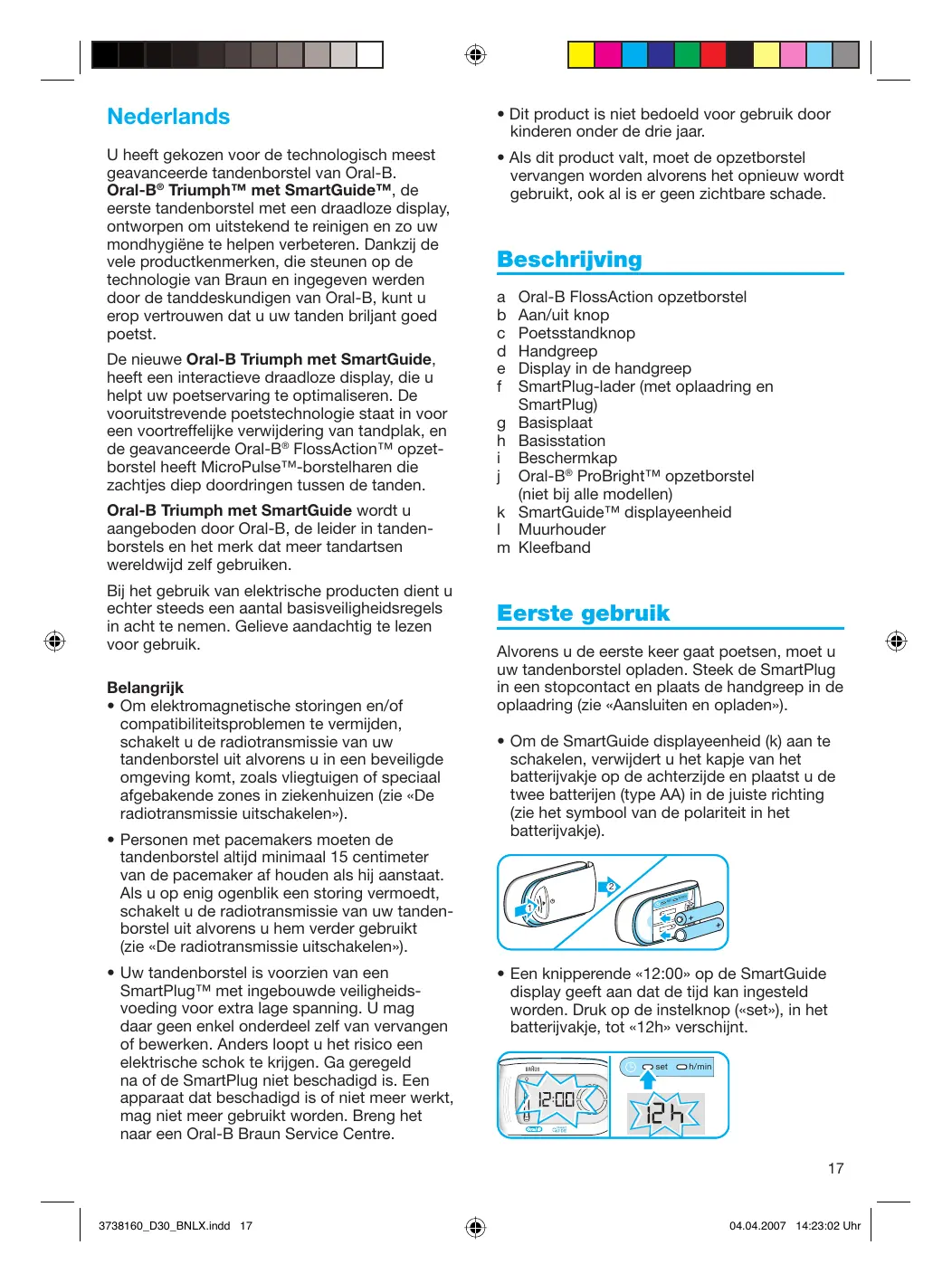 Nederlands U heeft gekozen voor de technologisch meest geavanceerde tandenborstel van Oral-B. Oral-B° Triumph'" met SmartGuide"", de eerste tandenborstel met een draadloze display, ontworpen om uitstekend te reinigen en zo uw mondhygiëne te helpen verbeteren. Dankzij de vele productkenmerken, die steunen op de technologie van Braun en ingegeven werden door de tanddeskundigen van Oral-B, kunt u erop vertrouwen dat u uw tanden briljant goed poetst. De nieuwe Oral-B Triumph met SmartGuide, heeft een interactieve draadloze display, die u helpt uw poetservaring te optimaliseren. De vooruitstrevende poetstechnologie staat in voor een voortreffelike verwijdering van tandplak, en de geavanceerde Oral-B° FlossAction"" opzet- borstel heeft MicroPulseTM-borstelharen die zachtjes diep doordringen tussen de tanden. Oral-B Triumph met SmartGuide wordt u aangeboden door Oral-B, de leider in tanden- borstels en het merk dat meer tandartsen wereldwijd zelf gebruiken. Bij het gebruik van elektrische producten dient u echter steeds een aantal basisveiligheidsregels in acht te nemen. Gelieve aandachtig te lezen voor gebruik. Belangrijk + Om elektromagnetische storingen en/of compatibiliteitsproblemen te vermijden, schakelt u de radiotransmissie van uw tandenborstel uit alvorens u in een beveiligde omgeving komt, zoals vliegtuigen of speciaal afgebakende zones in ziekenhuizen (zie «De radiotransmissie uitschakelen»). + Personen met pacemakers moeten de tandenborstel altijd minimaal 15 centimeter van de pacemaker af houden als hij aanstaat. Als u op enig ogenblik een storing vermoedi, schakelt u de radiotransmissie van uw tanden- borstel uit alvorens u hem verder gebruikt (ie «De radiotransmissie uitschakelen»). + Uw tandenborstel is voorzien van een SmartPlug'" met ingebouwde veiligheids- voeding voor extra lage spanning. Ü mag daar geen enkel onderdeel zelf van vervangen of bewerken. Anders loopt u het risico een elektrische schok te krijgen. Ga geregeld na of de SmartPlug niet beschadigd is. Een apparaat dat beschadigd is of niet meer werkt, mag niet meer gebruikt worden. Breng het naar een Oral-B Braun Service Centre. 3738160 _D30_BNLX.indd 17