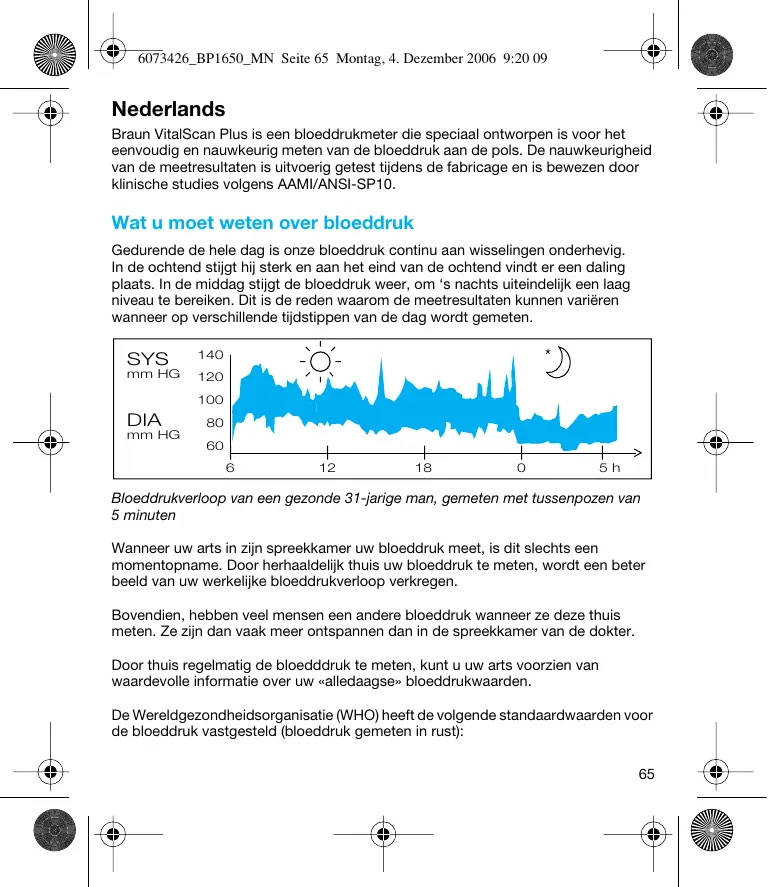 6073426_BP1650_MN Seite 65 Montag, 4. Dezember 2006 9:20 09 Nederlands Braun VitalScan Plus is een bloeddrukmeter die speciaal ontworpen is voor het eenvoudig en nauwkeurig meten van de bloeddruk aan de pols. De nauwkeurigheid van de meetresultaten is uitvoerig getest tijdens de fabricage en is bewezen door klinische studies volgens AAMI/ANSI-SP10. Wat u moet weten over bloeddruk Gedurende de hele dag is onze bloeddruk continu aan wisselingen onderhevig. In de ochtend stijgt hij sterk en aan het eind van de ochtend vindt er een daling plaats. In de middag stijgt de bloeddruk weer, om ‘s nachts uiteindelijk een laag niveau te bereiken. Dit is de reden waarom de meetresultaten kunnen variëren wanneer op verschillende tijdstippen van de dag wordt gemeten. SYS