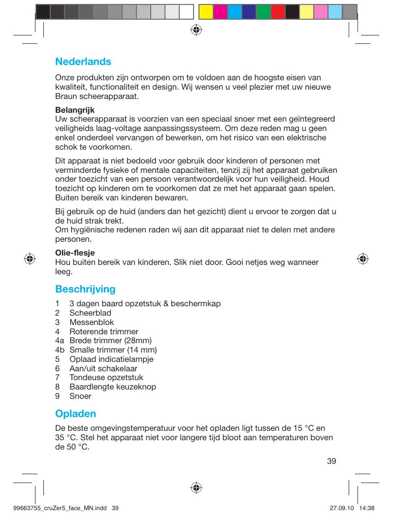 Nederlands Onze produkten zijn ontworpen om te voldoen aan de hoogste eisen van kwaliteit, functionaliteit en design. Wij wensen u veel plezier met uw nieuwe Braun scheerapparaat. Belangrijk Uw scheerapparaat is voorzien van een speciaal snoer met een geïntegreerd veiligheids laag-voltage aanpassingssysteem. Om deze reden mag u geen enkel onderdeel vervangen of bewerken, om het risico van een elektrische schok te voorkomen. Dit apparaat is niet bedoeld voor gebruik door kinderen of personen met verminderde fysieke of mentale capaciteiten, tenzij zij het apparaat gebruiken onder toezicht van een persoon verantwoordelijk voor hun veiligheid. Houd toezicht op kinderen om te voorkomen dat ze met het apparaat gaan spelen. Buiten bereik van kinderen bewaren. Bij gebruik op de huid (anders dan het gezicht) dient u ervoor te zorgen dat u de huid strak trekt. Om hygiënische redenen raden wij aan dit apparaat niet te delen met andere personen. Olie-flesje Hou buiten bereik van kinderen. Slik niet door. Gooi netjes weg wanneer leeg. Beschrijving