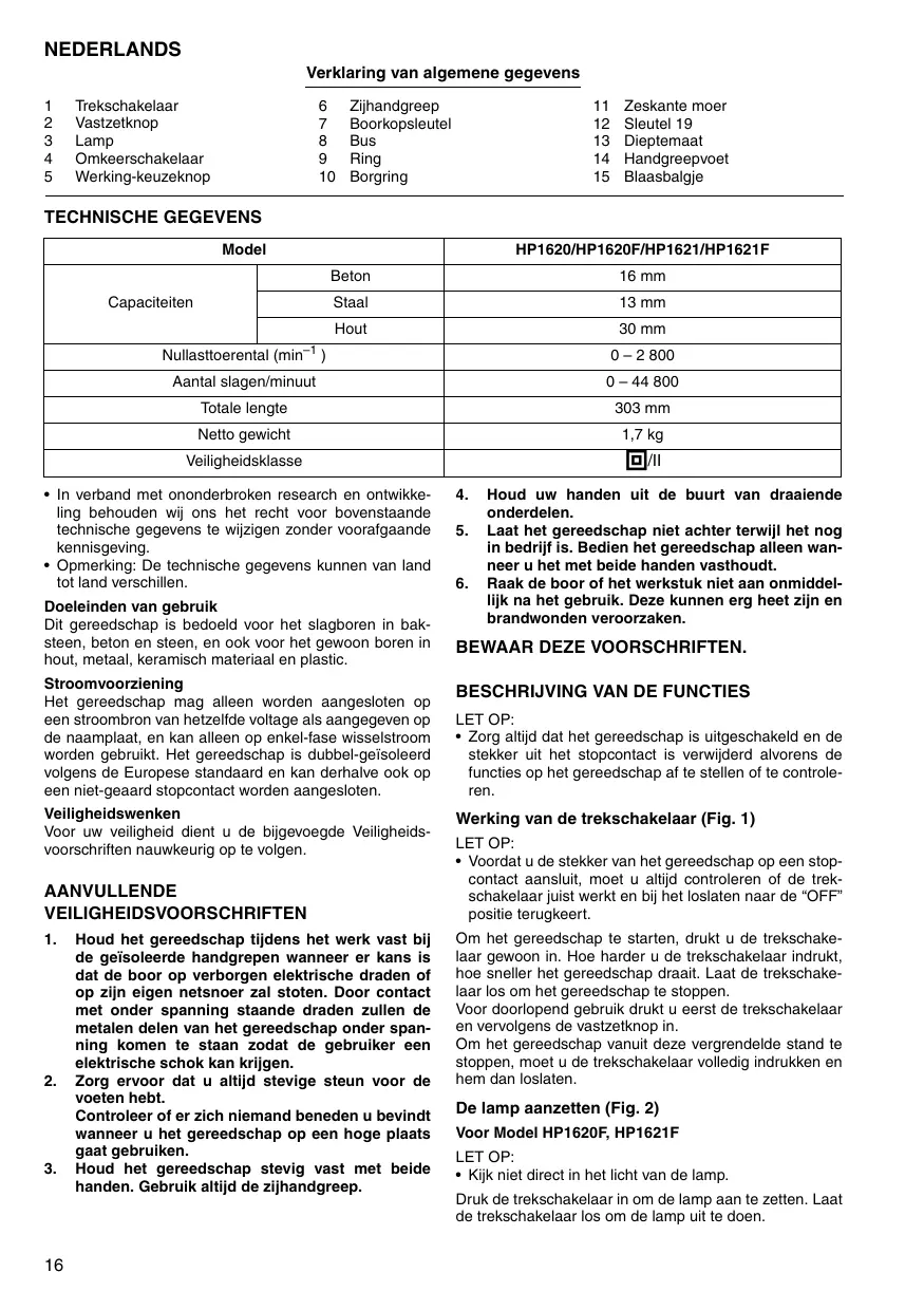 Zeskante moer Sleutel 19 Dieptemaat Handgreepvoet Blaasbalgje TECHNISCHE GEGEVENS Model Capaciteiten HP1620/HP1620F/HP1621/HP1621F Beton 16 mm Staal 13 mm Hout 30 mm Nullasttoerental (min–1 ) 0 – 2 800 Aantal slagen/minuut 0 – 44 800 Totale lengte 303 mm Netto gewicht 1,7 kg a/II Veiligheidsklasse