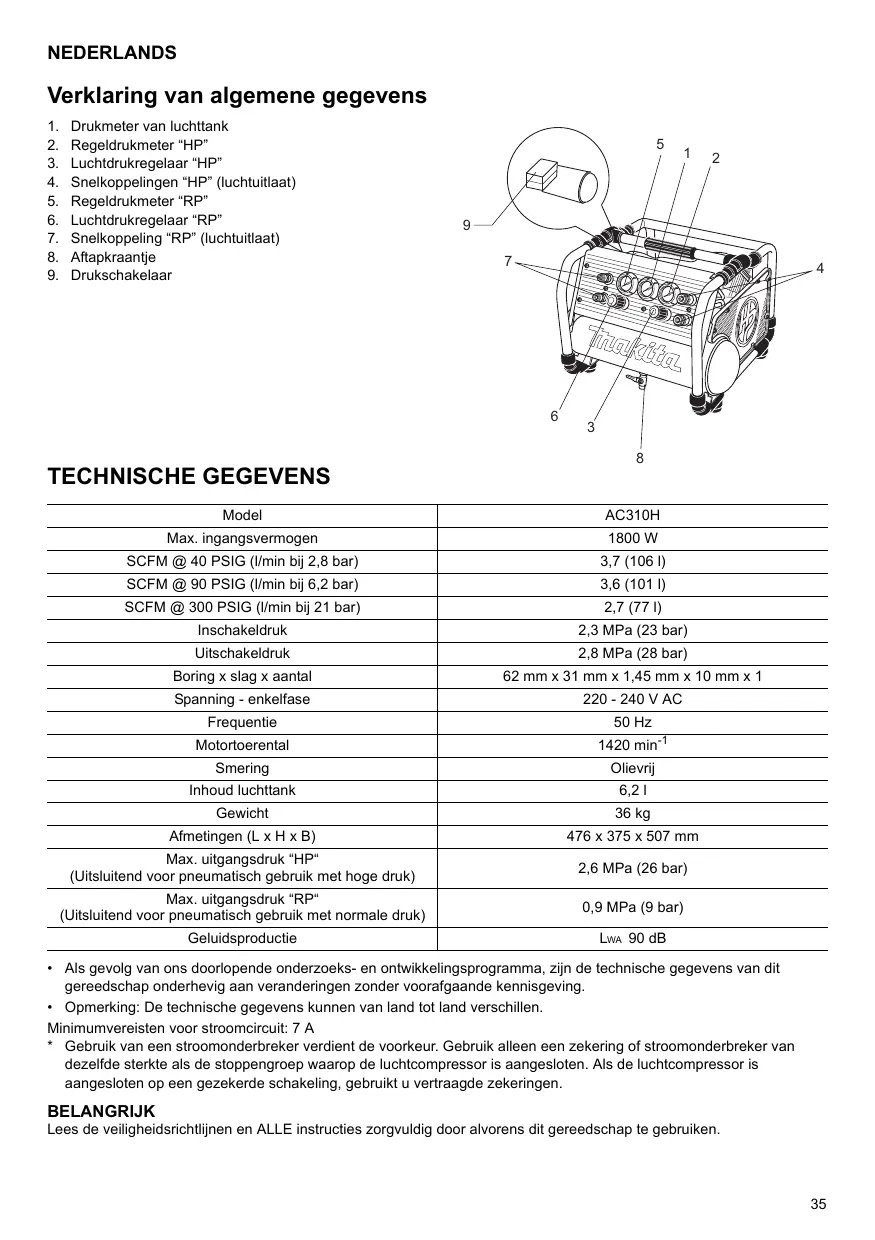 NEDERLANDS Verklaring van algemene gegevens Drukmeter van luchttank Regeldrukmeter ‘Hi Luchtdrukregelaar “HP” Snelkoppelingen “HP” (luchtuitlaat) Regeldrukmeter “RP' Luchtdrukregelaar “RP” Snelkoppeling “RP” (luchtuitlaat) Aftapkraantie Drukschakelaar poNpnswn TECHNISCHE GEGEVENS Model AC310H Max. ingangsvermogen 1800 W SCFM @ 40 PSIG (Umin bij 2,8 bar) 37 (1061) SCFM @ 90 PSIG (Umin bij 6,2 bar) 36(1011) SCFM @ 300 PSIG (min bij 21 bar) 27(771) Inschakeldruk 2,3 MPa (23 bar) Uitschakeldruk 2,8 MPa (28 bar) Boring x slag x aantal 62 mm x 31 mm x 1,45 mm x 10 mm x 1 Spanning - enkelfase 220 - 240 V AC Frequentie 50 Hz Motortoerental 1420 min? Smering Olievrij Inhoud Iuchttank 621 Gewicht 36 kg Afmetingen (L x H x B) 476 x 375 x 507 mm Max. uitgangsdruk “HP {Uitsluitend voor pneumatisch gebruik met hoge druk) 2,6 MPa (26 bar) Max. uitgangsdruk “RP {Uitsluitend voor pneumatisch gebruik met normale druk) 0,9 MPa (9 bar) Geluidsproductie Lua 90 dB +_Als gevolg van ons doorlopende onderzoeks- en ontwikkelingsprogramma, zijn de technische gegevens van dit gereedschap onderhevig aan veranderingen zonder voorafgaande kennisgeving. + Opmerking: De technische gegevens kunnen van land tot land verschillen. Minimumvereisten voor stroomcircuit: 7 A *_ Gebruik van een stroomonderbreker verdient de voorkeur. Gebruik alleen een zekering of stroomonderbreker van dezelfde sterkte als de stoppengroep waarop de luchicompressor is aangesloten. Als de luchtcompressor is aangesloten op een gezekerde schakeling, gebruikt u vertraagde zekeringen. BELANGRIK Lees de veiligheidsrichtlinen en ALLE instructies zorgvuldig door alvorens dit gereedschap te gebruiken.