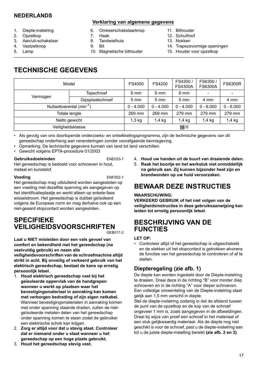 TECHNISCHE GEGEVENS FS4300 / | FS6300/ Model FS4000 | FS4200 | ÉSéaoon | r863004 | FS8300R Tapschroef 6 mm 6 mm 6mm = = Vermogen Gipsplaatschroef 5mm 5mm 5 mm 4 mm 4 mm Nullasttoerental (min) 0-4.000 | 0-4.000 | 0-4.000 | 0-6.000 | 0-6.000 Totale lengte 269 mm | 269 mm | 279mm | 279mm | 279mm Netto gewicht 13kg 14kg 14kg 14kg 14kg Veiligheidsklasse CII +_Als gevolg van ons doorlopende onderzoeks- en ontwikkelingsprogramma, zijn de technische gegevens van dit gereedschap onderhevig aan veranderingen zonder voorafgaande kennisgeving. + Opmerking: De technische gegevens kunnen van land tot land verschillen. + Gewicht volgens EPTA-procedure 01/2003 Gebruiksdoeleinden ENE033-1 Het gereedschap is bedoeld voor schroeven in hout, metal en kunststof. Voeding ENFO02-1 Het gereedschap mag uitsluitend worden aangesloten op een voeding met dezelfde spanning als aangegeven op het identificatieplaatje en werkt alleen op enkele-fase wisselstroom. Het gereedschap is dubbel geisoleerd volgens de Europese norm en mag derhalve ook op een niet-geaard stopcontact worden aangesloten. SPECIFIEKE VEILIGHEIDSVOORSCHRIFTEN GEBO17-2 Laat u NIET misleiden door een vals gevoel van comfort en bekendheid met het gereedschap (na veelvuldig gebruik) en neem alle veiligheidsvoorschriften van de schroefmachine aitijd Strikt in acht. Bij onveilig of verkeerd gebruik van het elektrisch gereedschap, bestaat de kans op ernstig persoonlijk letsel.